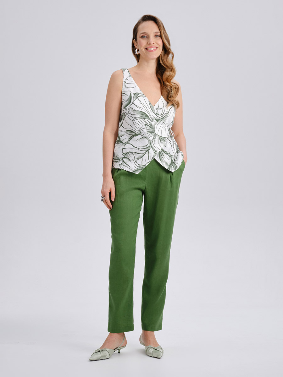 Блуза-топ прилегающего кроя на запах. Имеет V-образный вырез, застежка на завязках. Выполнена из смесовой ткани из вискозы и льна.