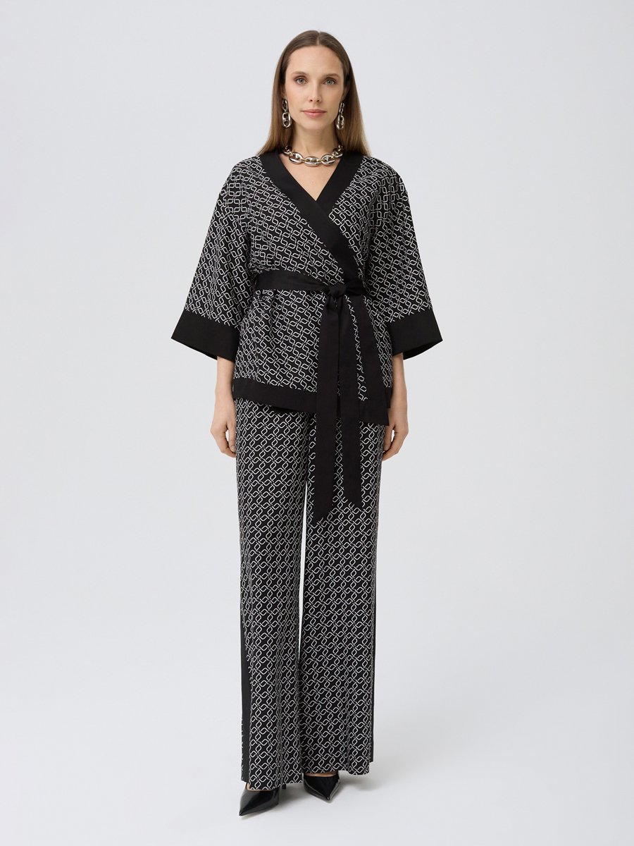 Кимоно с ассиметричным запахом свободного прямого кроя с V-образной горловиной. Выполнено из 100% тенселя, без подкладки. У кимоно плечо спущенное, длина рукава 3/4, с контрастными манжетами. Кимоно дополнено съемным поясом, внутри имеются атласные завязки.