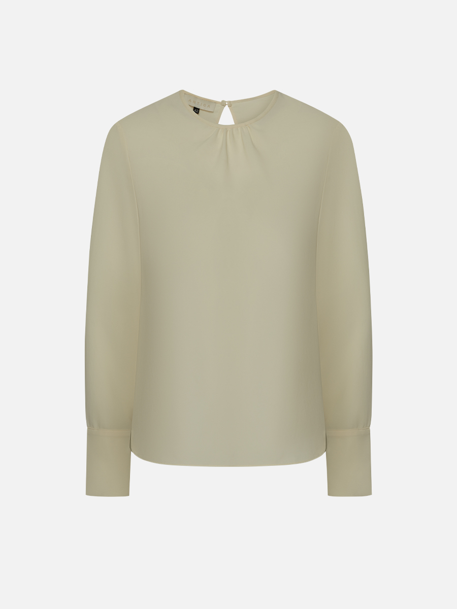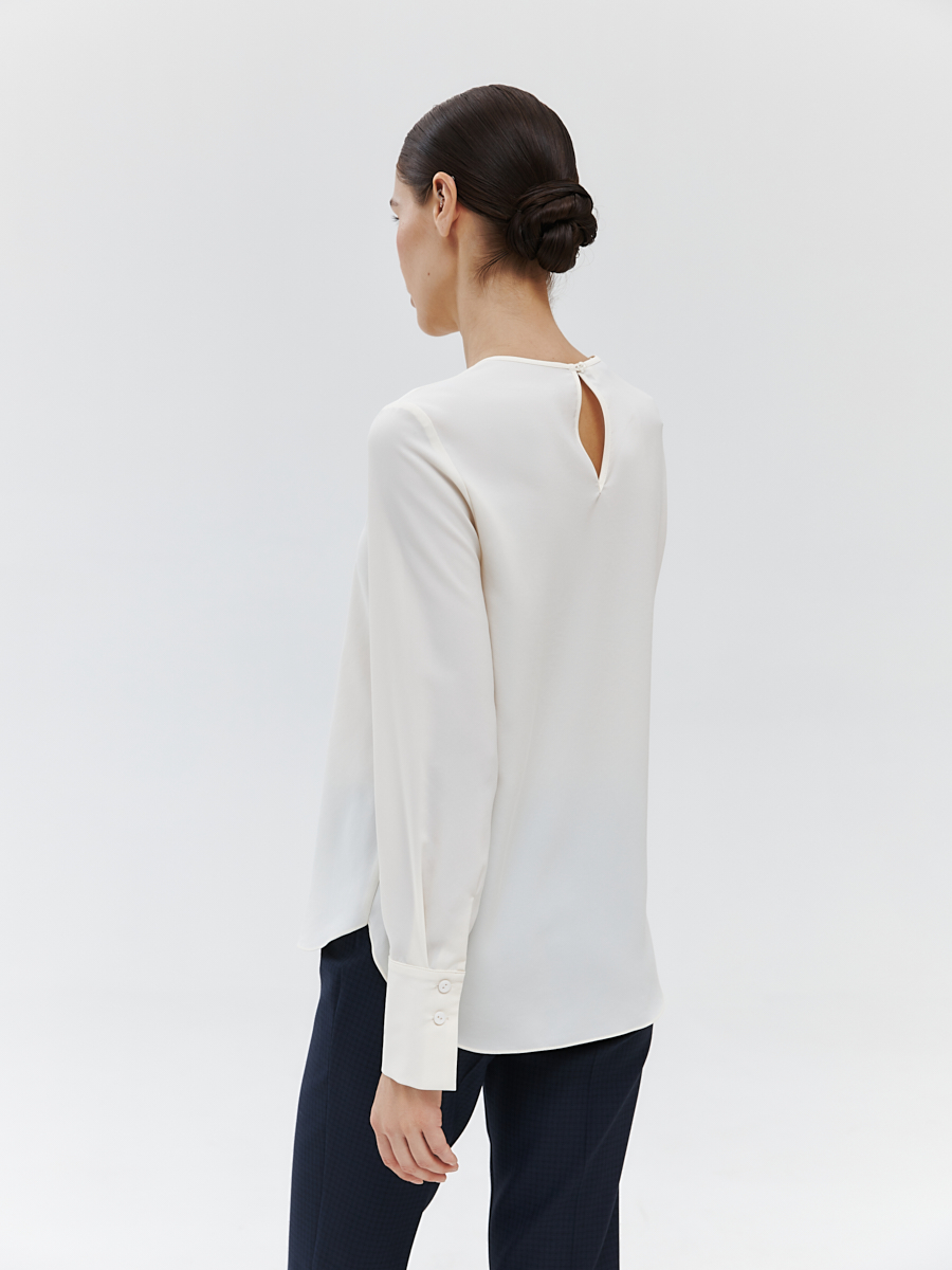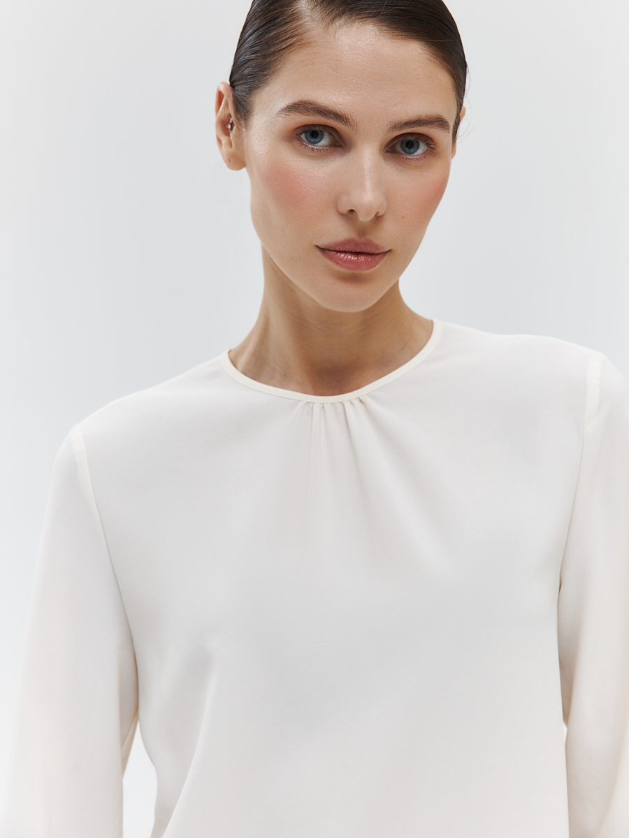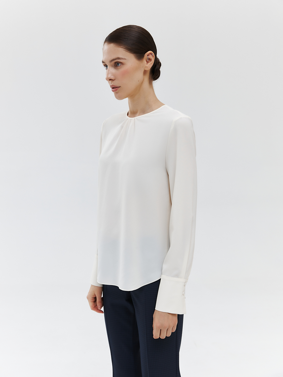Тонкая и нежная блуза прямого кроя замечательно впишется в любой деловой гардероб. Горловина со сборкой создает акцентный элемент, не привлекая к себе слишком много внимания, а широкие манжеты на рукавах подчеркнут узкие запястья. ¶¶• прямой силуэт¶• втачной рукав полной длины¶• широкие манжеты¶• круглая горловина со сборкой¶• застежка-”капелька” (потайная петля и пуговица) сзади
