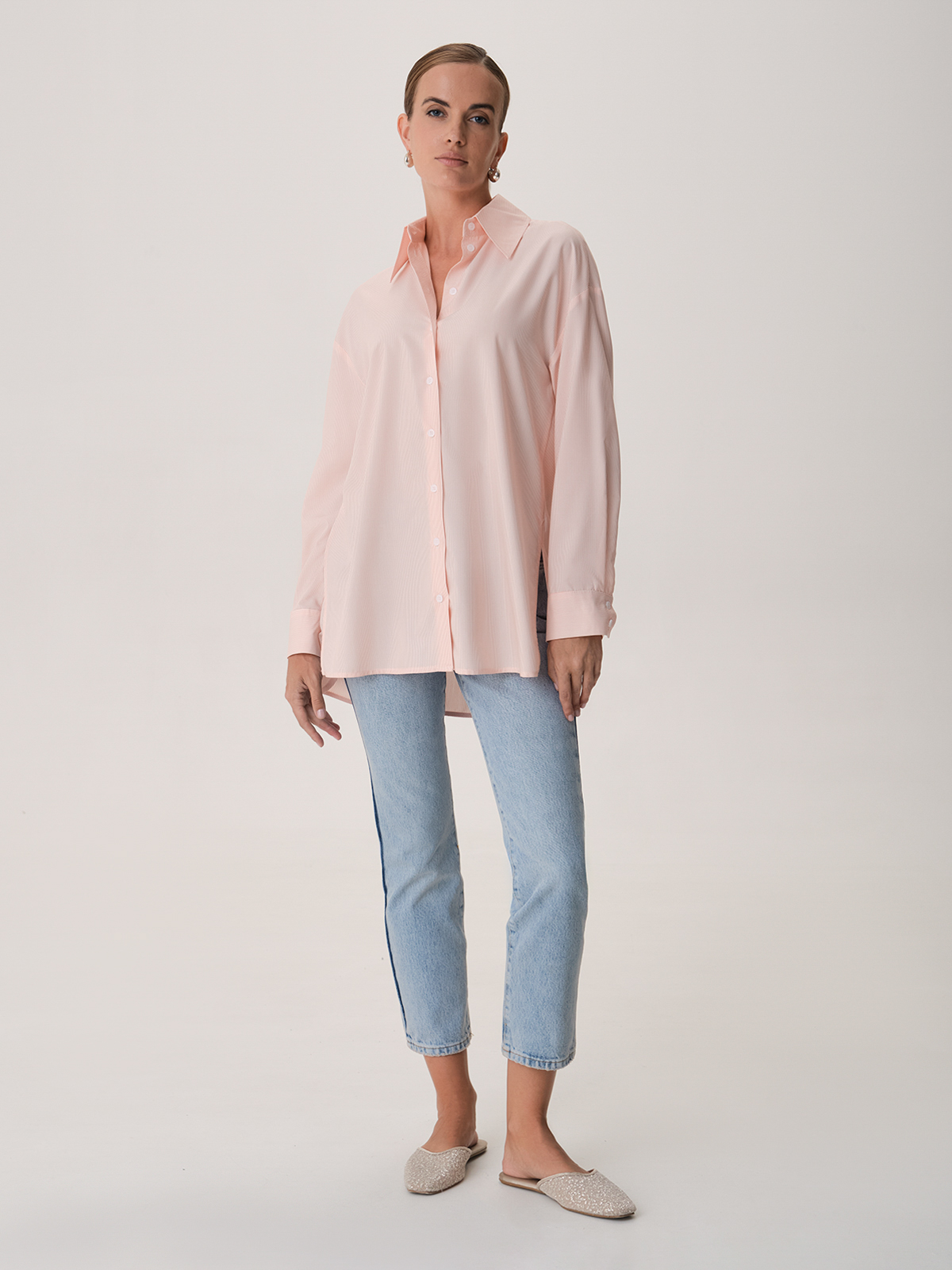 Легкая oversize рубашка в мелкую клетку идеально впишется в свежие повседневные образы. Прямой свободный крой модели отлично сядет на любой тип фигуры и будет гармонично смотреться с большим количеством вариаций низа. Можно носить как в заправленном виде с брюками и джинсами, так и навыпуск. Отличительная особенность данного изделия - асимметричный фигурный низ и разрезы в боковых швах.