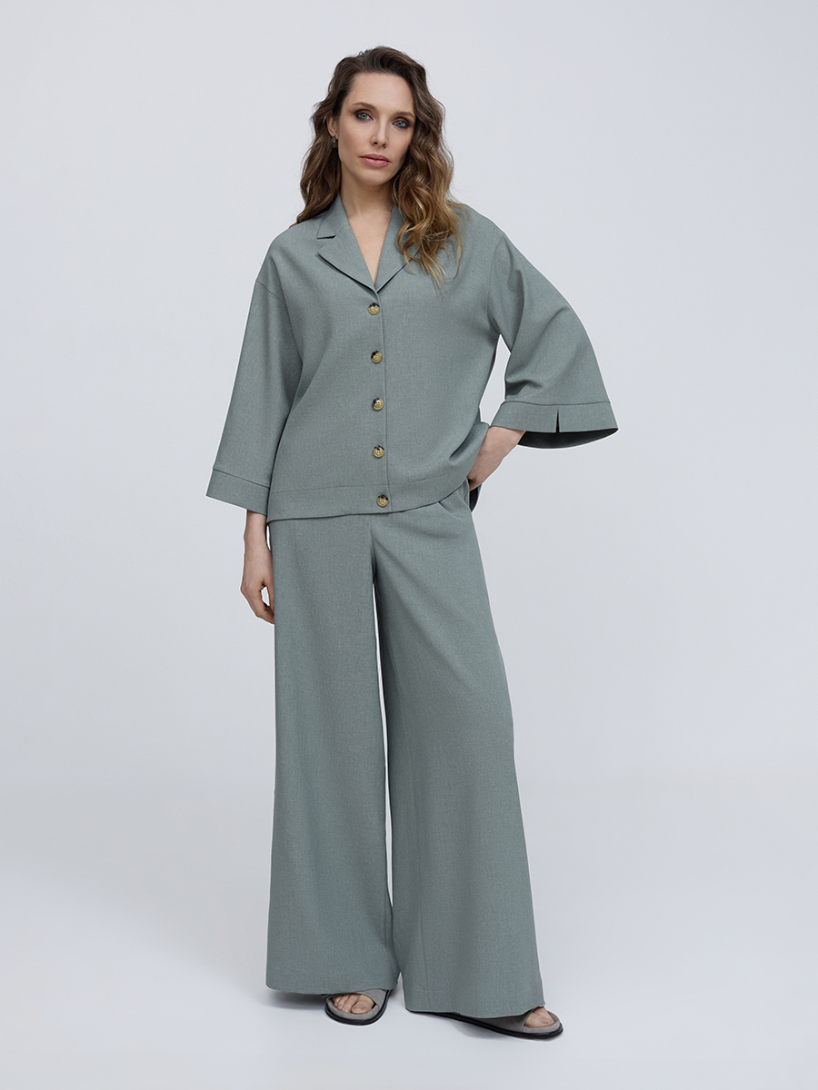 Рубашка прямого силуэта с отложным воротником. Низ изделия выполнен с перепадом, низ спинки фигурный. Рукава широкие с небольшими разрезами в длине 3/4.