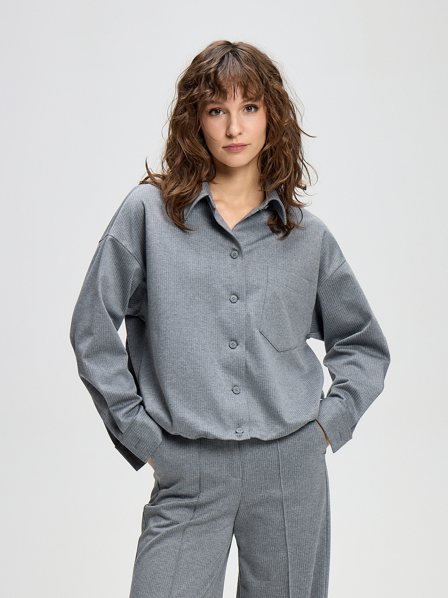 Эта стильная рубашка имеет современный крой, напоминающий классический бомбер — слегка свободный, с акцентом на плечах и спущенным рукавом. Элегантный серый цвет с вертикальной белой полоской визуально вытягивает силуэт, делая его более стройным и динамичным. Кулиска по низу рубашки обеспечивает идеальную посадку, комфорт и позволяет создать аккуратный, слегка присборенный силуэт.