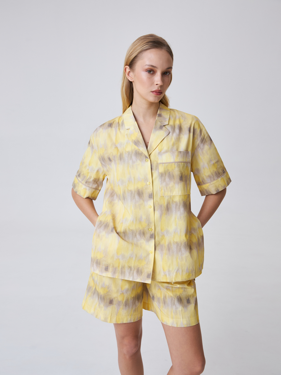 Яркая и запоминающаяся oversize рубашка с градиентным принтом. Модель выполнена из 100% хлопка премиального качества и отлично подойдет для стильных образов в жаркую погоду. Свободные рукава представлены в длине до локтя, а отложной воротник пиджачного типа образует V-образный вырез горловины. Спереди расположен вместительный функциональный карман. Рубашка застегивается на ряд маленьких круглых пуговиц желтого цвета в тон изделия.