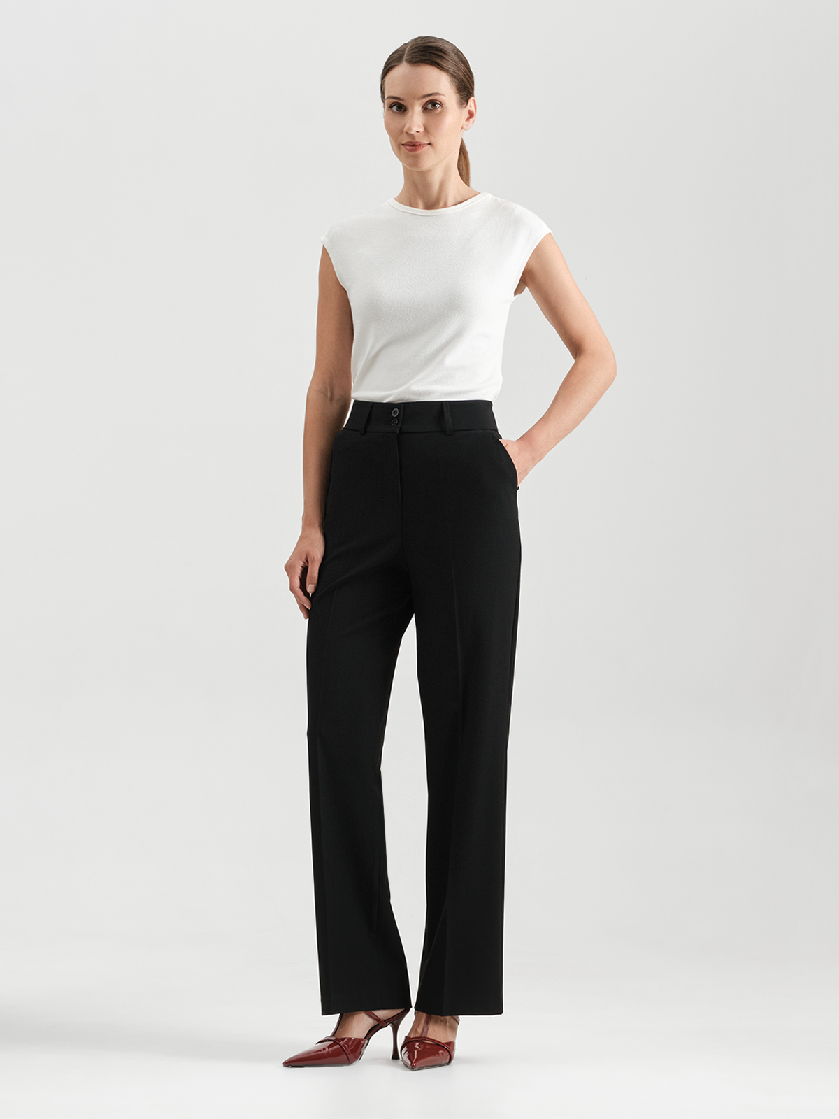 Изделие выполнено из качественной ткани: 64% полиэстера, 32% вискозы и 4% эластана, что делает брюки устойчивыми к сминанию и приятными на ощупь. Благодаря своей лаконичности и четкой геометрии, модель легко сочетается с блузами, пиджаками или базовыми футболками. Идеальный выбор для тех, кто ценит элегантность в каждой детали и ищет безупречную посадку.