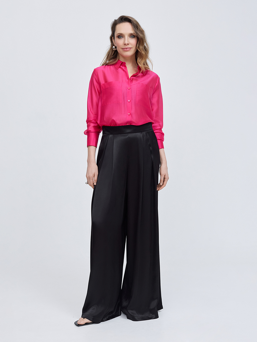 Женские брюки-палаццо чёрного цвета — воплощение утончённой элегантности и современного стиля. Благодаря свободному крою и струящейся фактуре ткани, они придают образу легкость и изысканность. Высокая посадка подчёркивает талию, визуально удлиняя силуэт. Гладкая поверхность материала с деликатным блеском подчёркивает роскошный характер модели, делая её идеальным выбором как для вечернего выхода, так и для офисного образа в стиле smart casual.