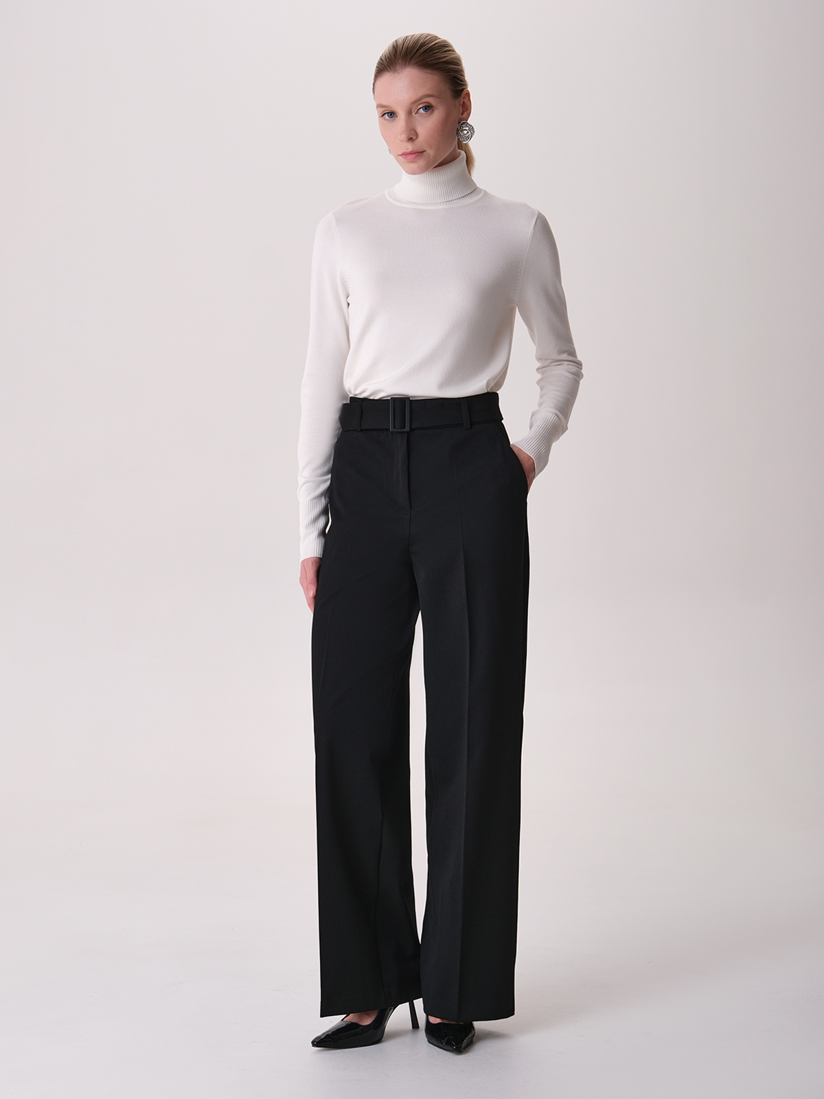 Свободные прямые брюки вот уже несколько сезонов считаются ведущим трендом классического гардероба. Представленная модель выполнена из плотной костюмной ткани черного цвета со съемным широким ремнем в комплекте. Металлическая пряжка на ремне выступает основной деталью - объемной, но лаконичной. По всей длине изделия проходят заутюженные стрелки, а спереди имеются вместительные карманы.