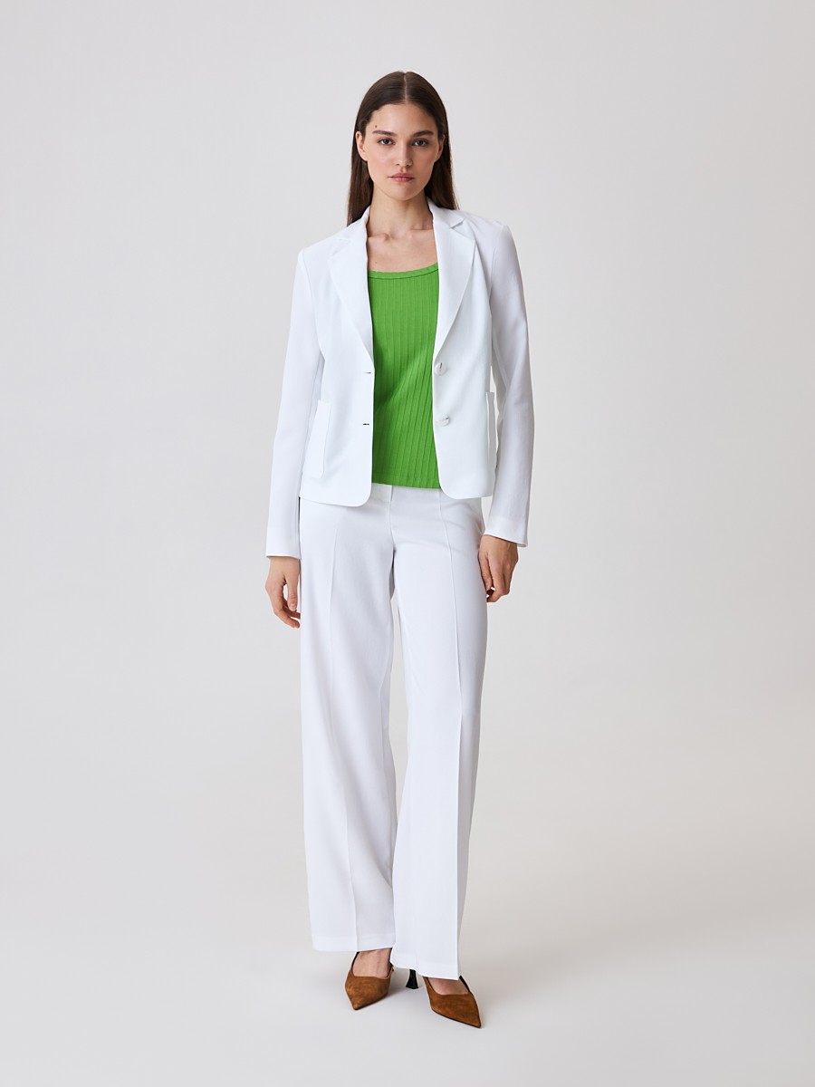 Классические брюки в кипенно-белом цвете - отличный вариант для ярких и свежих образов. Модель выполнена из легкой ткани, приятной к телу. Высокий пояс и вытачки на задней части изделия обеспечивают комфортную посадку по фигуре и создают акцент на талии. Свободный прямой крой в союзе с заутюженными стрелками визуально стройнят силуэт, а полная длина позволяет сочетать брюки с большим количеством вариантов обуви. Спереди имеются вместительные карманы, а сзади декоративный карман в виде прямоугольной строчки.