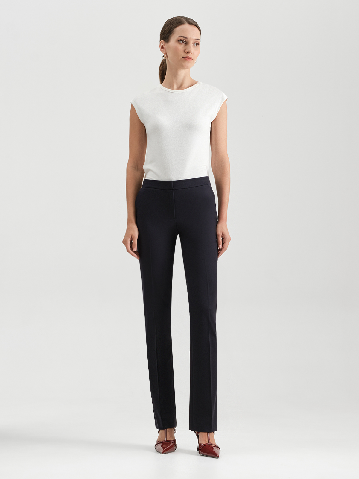Брюки прямые от колена со стрелками и немного заниженной посадкой идеально подходят для любой фигуры, скрывая недостатки. Строгий темно-синий цвет прекрасно смотрятся с пиджаками и любыми рубашками или футболками.¶¶• прямые от колена¶• немного заниженная посадка¶• отрезной пояс¶• застежка на брючную молнию, крючок и пуговицу¶• на передних половинках рабочие карманы¶• сзади талиевые вытачки и один нерабочий карман