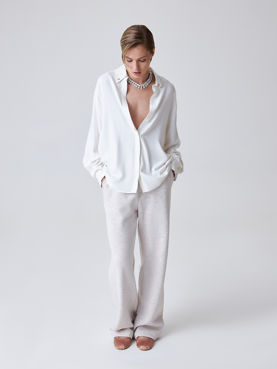 Свободные трикотажные брюки в спортивном стиле избавят Вас от постоянных мук при составлении повседневных образов. Универсальная модель цвета слоновой кости отлично сядет на любую фигуру благодаря особенностям кроя. Анатомическая средняя посадка и пояс на резинке обеспечивают максимальный комфорт и свободу в движении. Полная длина и прямой крой визуально удлиняют силуэт, а спереди имеются вместительные карманы.