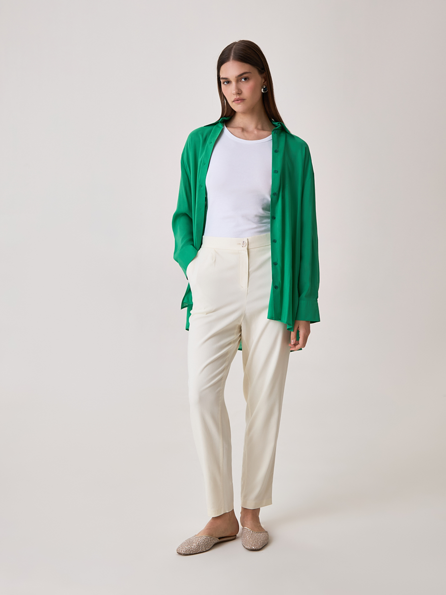 Женские брюки актуального кроя кэррот из легкого шелковистого материала базового молочного оттенка. Зауженная к низу модель свободно сидит на бедрах, что позволяет скорректировать силуэт и выгодно подчеркнуть достоинства фигуры. В паре с контрастной блузкой или рубашкой из наших коллекций брюки создадут интересный образ в стиле смарт-кэжуал.