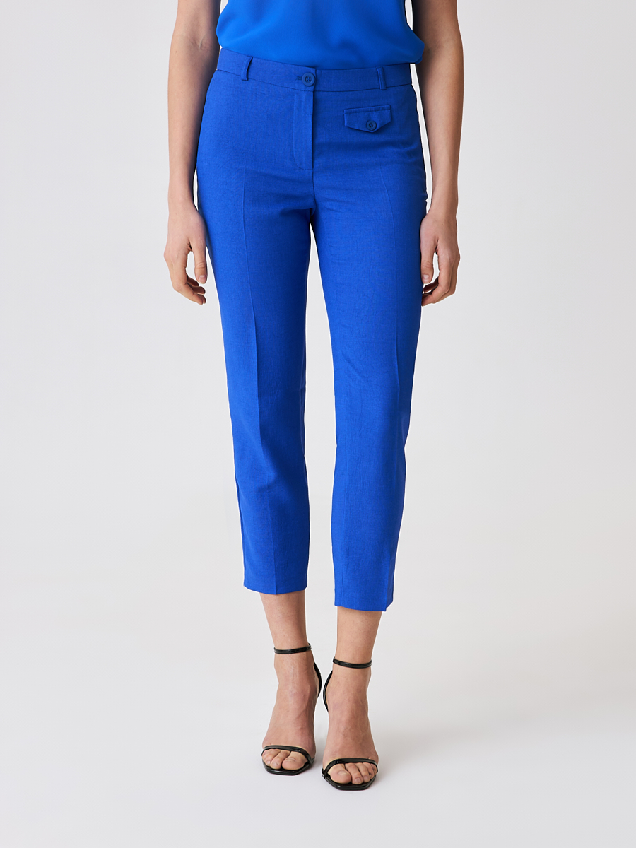 Женские брюки из фактурного материала яркого оттенка electric blue внесут свежесть и новизну в сдержанный деловой дресс-код. Высокий притачной пояс и зауженные штанины подчеркивают стройность фигуры, формируя гармоничный силуэт. Сочетание брюк и базовой блузы создаст интересный комплект для официальной встречи или праздничного мероприятия.