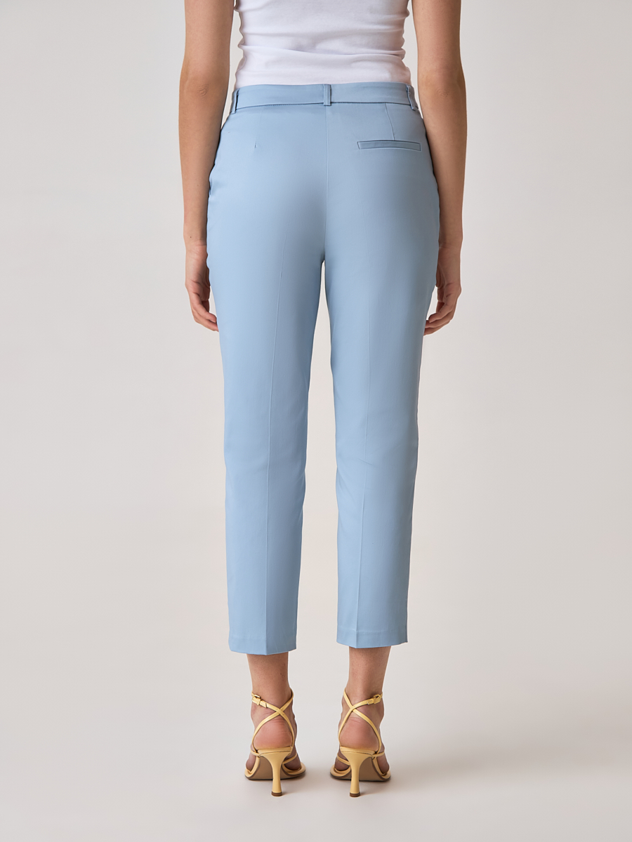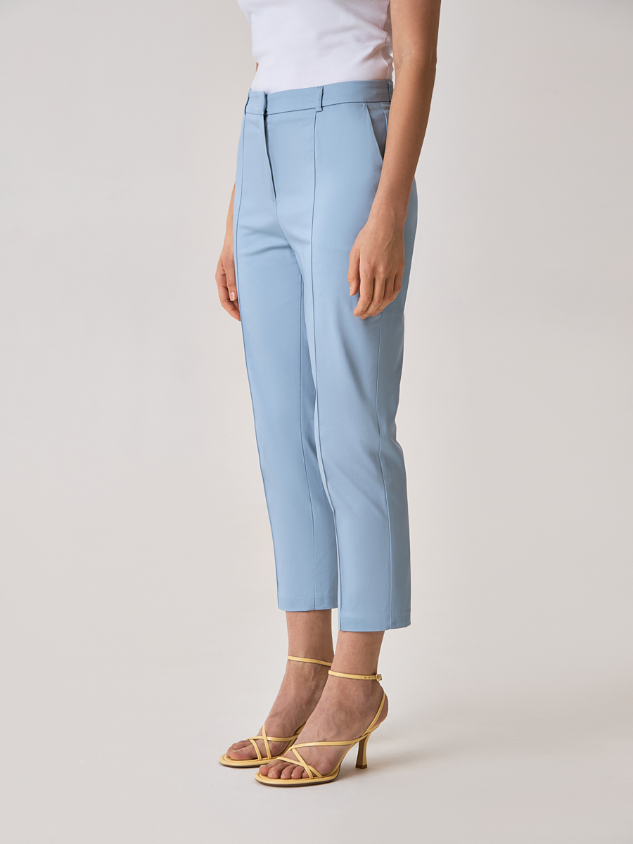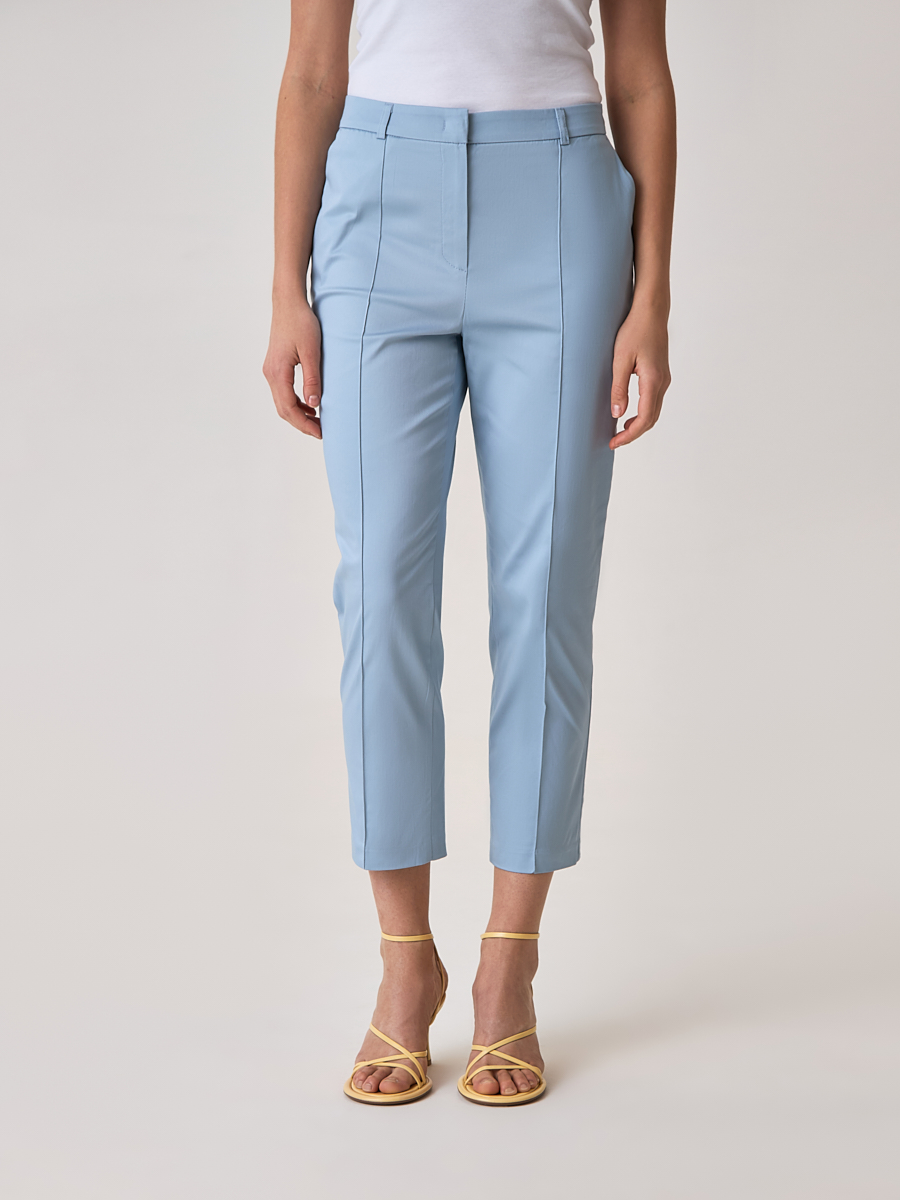 Укороченные женские брюки в цвете sky blue из натурального хлопкового материала станут альтернативой моделям базовых оттенков для офисного образа. Прямой, слегка зауженный к низу крой подчеркнет изящные женские формы, а декоративные стрелки зрительно добавят силуэту стройности. Брюки гармонично сочетаются с приталенными блузами и жакетами из наших коллекций.