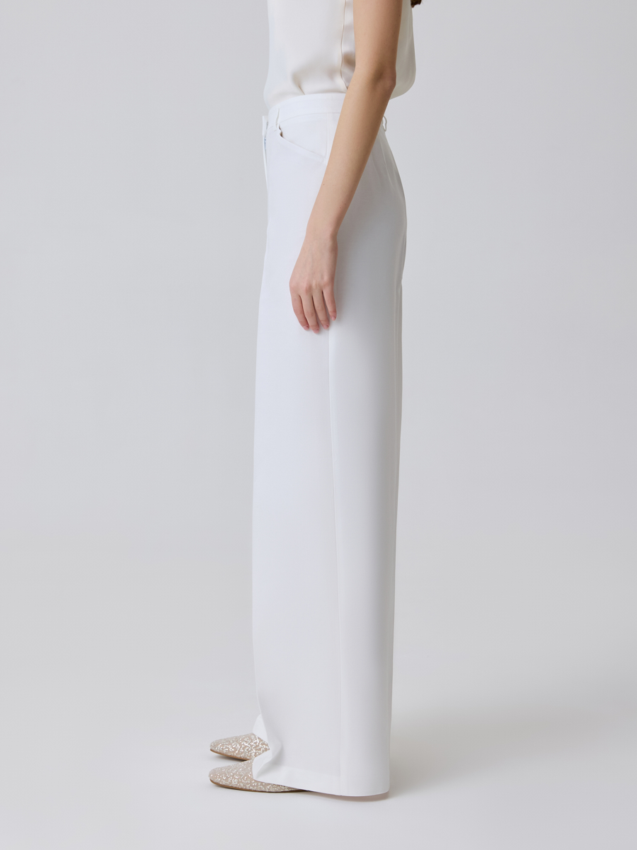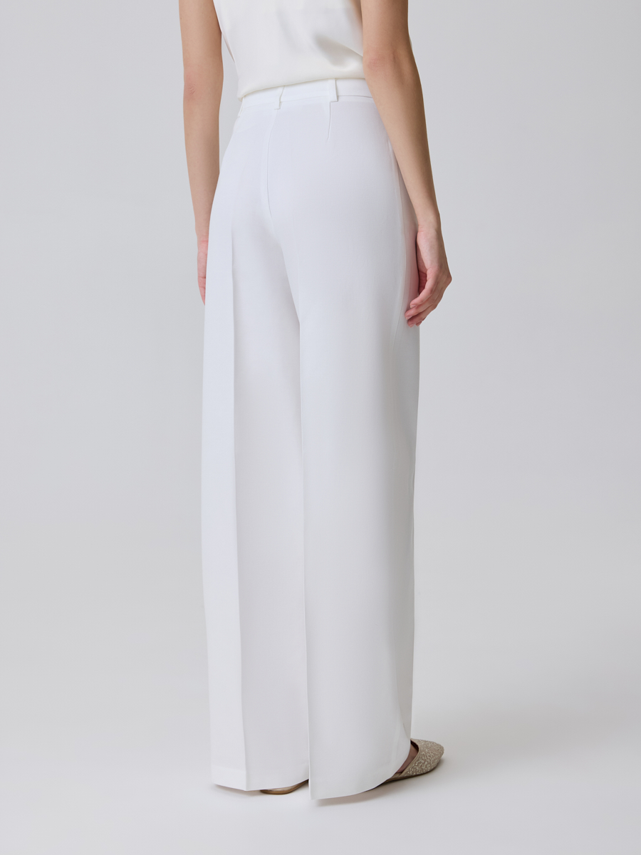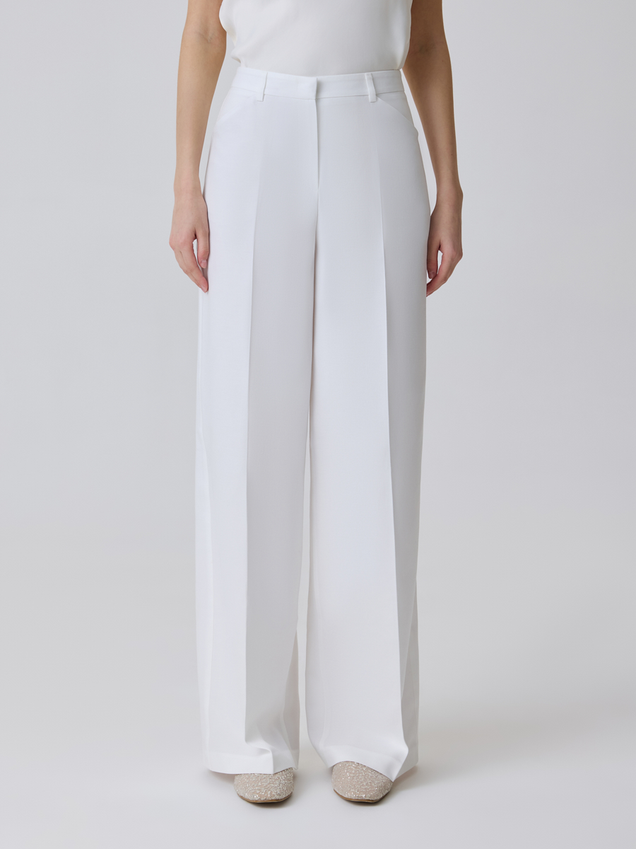 Брюки-палаццо - одна из самых комфортных в носке моделей классических брюк. Актуальный свободный крой и высокая посадка являются идеальным сочетанием для повседневных деловых образов. Данное изделие выполнено из плотной костюмной ткани белого цвета. По всей длине штанин проходят заутюженные вертикальные стрелки, которые визуально вытягивают силуэт и придают виду больше официальности. Спереди расположены вместительные карманы, а пояс по периметру оснащен шлевками для ремня.