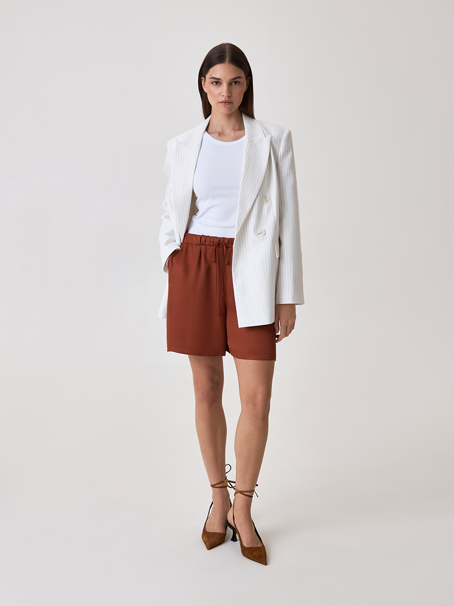 Короткие шорты свободного кроя в теплом коричневом оттенке. Высокая посадка оснащена резинкой для комфортной носки, а с помощью шнурка можно дополнительно регулировать размер. Спереди расположены функциональные карманы. Модель выполнена из легкой струящейся ткани с деликатным сатиновым блеском. Такие шорты станут идеальным вариантом для стильных и элегантных летних образов.