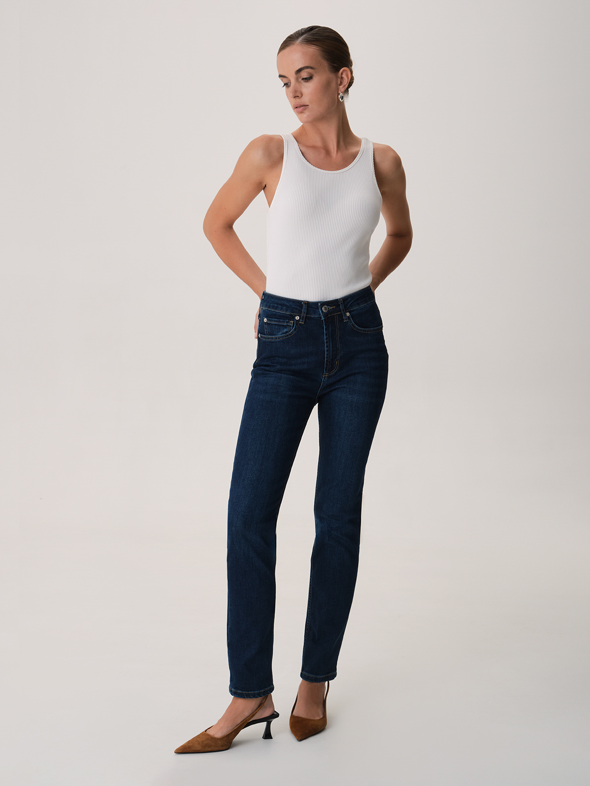 Классические женские джинсы прямого кроя в насыщенном синем оттенке — универсальная модель, которая станет базовым элементом гардероба. Высокая посадка подчёркивает талию и визуально удлиняет ноги, обеспечивая комфортную посадку и отличную поддержку. Благодаря лаконичному дизайну с пятью карманами и контрастной строчке, джинсы легко сочетаются как с повседневными топами, так и с более строгими блузами или жакетами.