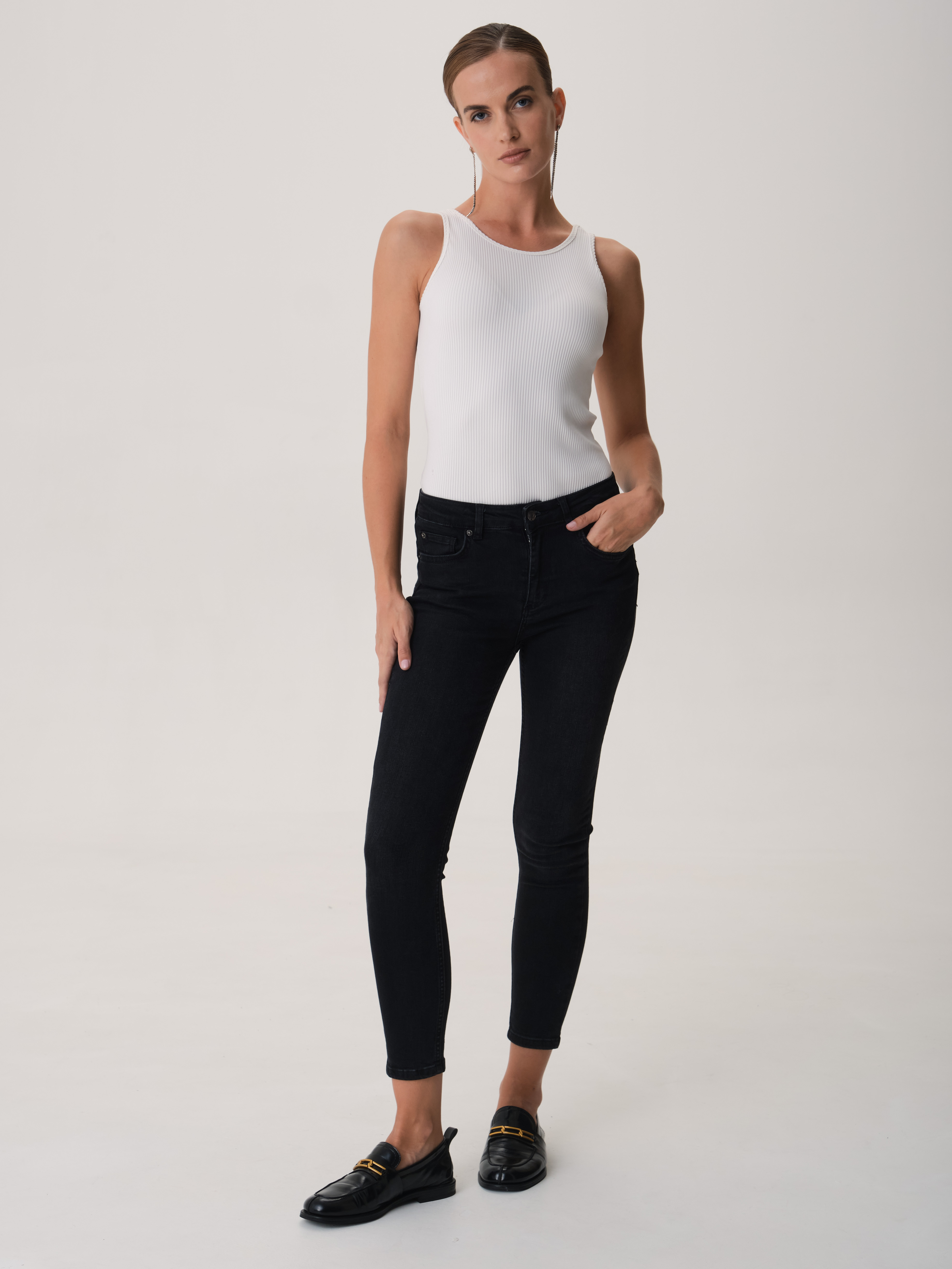 Джинсы скинни снова ворвались в тренды. Данная модель выполнена в универсальном черном цвете из плотной высококачественной джинсы. Удобная средняя посадка, длина 9/10 открывает щиколотки. Спереди и сзади имеются функциональные карманы, застежка на круглую пуговицу и молнию. Прилегающий силуэт выигрышно подчеркивает достоинства фигуры и деликатно их демонстрирует.