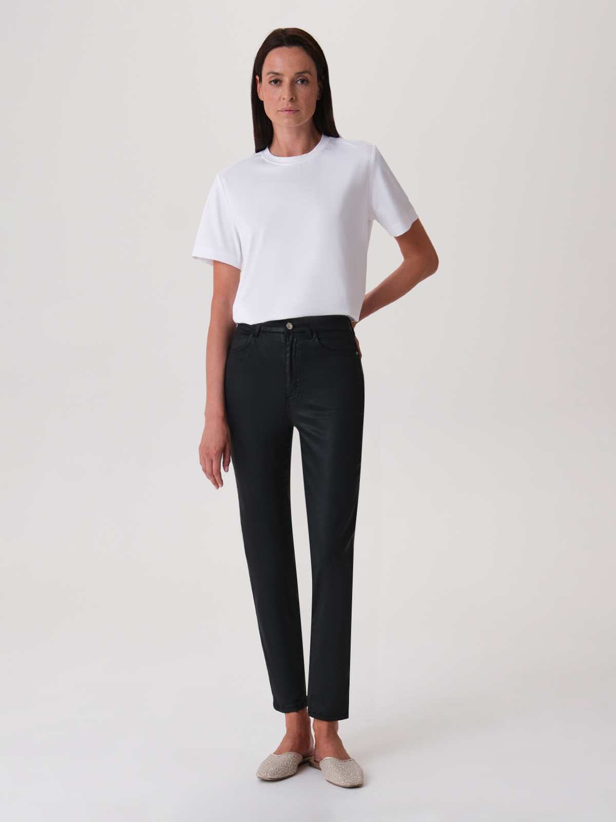Черные укороченные джинсы прилегающего кроя из плотной высококачественной ткани с деликатным сатиновым блеском. Модель на высокой посадке отлично сядет на любой тип фигуры и подчеркнет ее достоинства. V-образная строчка сзади визуально округляет бедра и создает гармоничные пропорции. Пояс оснащен шлевками для ремня, а спереди и сзади имеются функциональные карманы. Такие базовые джинсы станут основой для большого количества стильных повседневных образов.