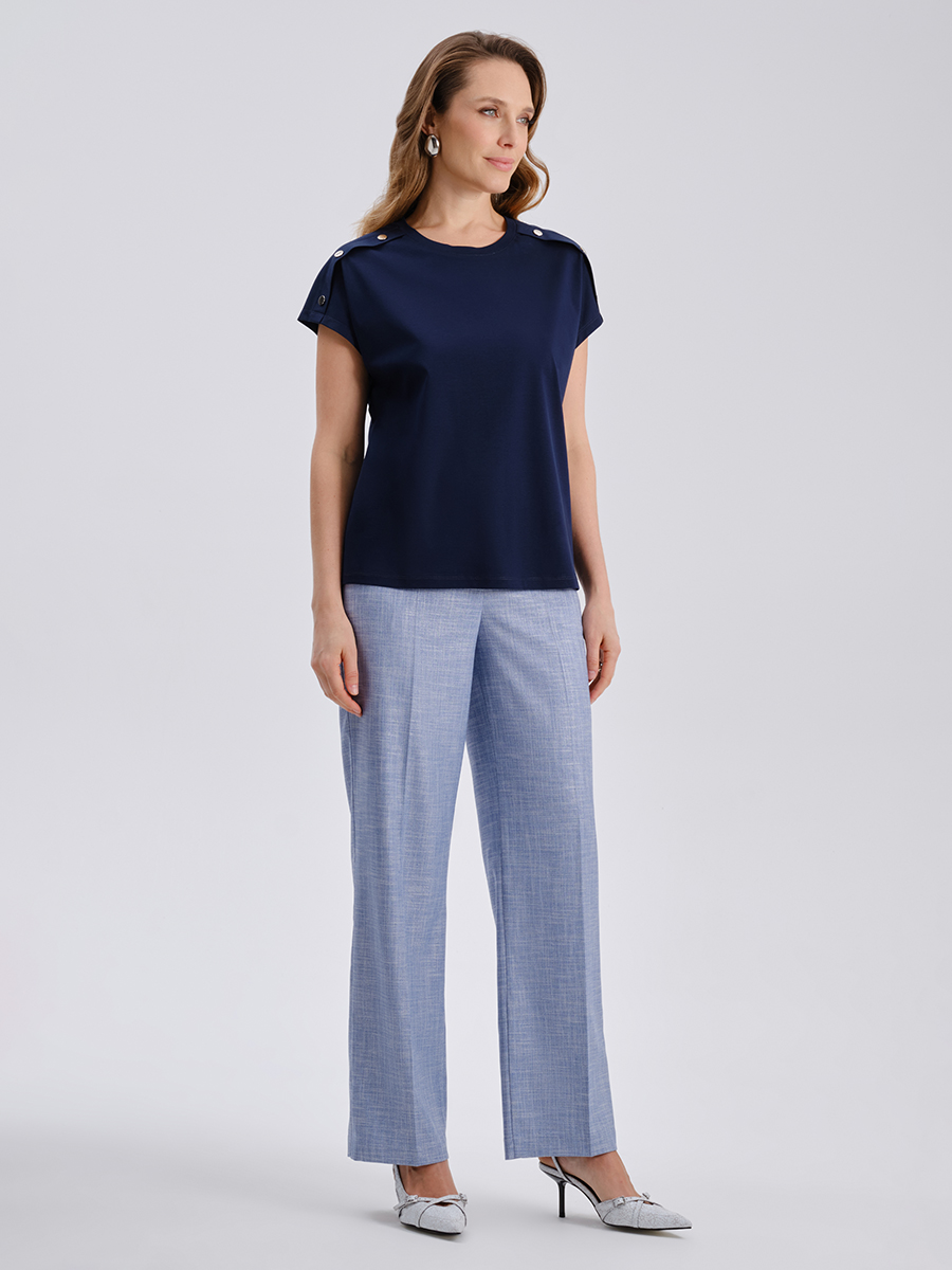 Тёмно-синяя футболка из 100% мерсеризованного хлопка — базовая модель с выразительными деталями, идеально подходящая для создания сдержанных и стильных образов. Прямой крой обеспечивает комфорт и свободу движений, а круглый вырез подчёркивает аккуратную линию шеи. Особенность дизайна — декоративные планки на плечах с металлическими кнопками, которые придают изделию современный и слегка утилитарный акцент.¶¶Мерсеризованный хлопок делает ткань особенно гладкой, придаёт ей лёгкий шелковистый блеск и повышенную износостойкость. Натуральный состав дарит коже комфорт, а плотность материала помогает футболке сохранять форму и свежий вид в течение всего дня. Модель универсальна: гармонично сочетается с брюками, юбками или жакетами и может стать основой как повседневного, так и smart casual образа.