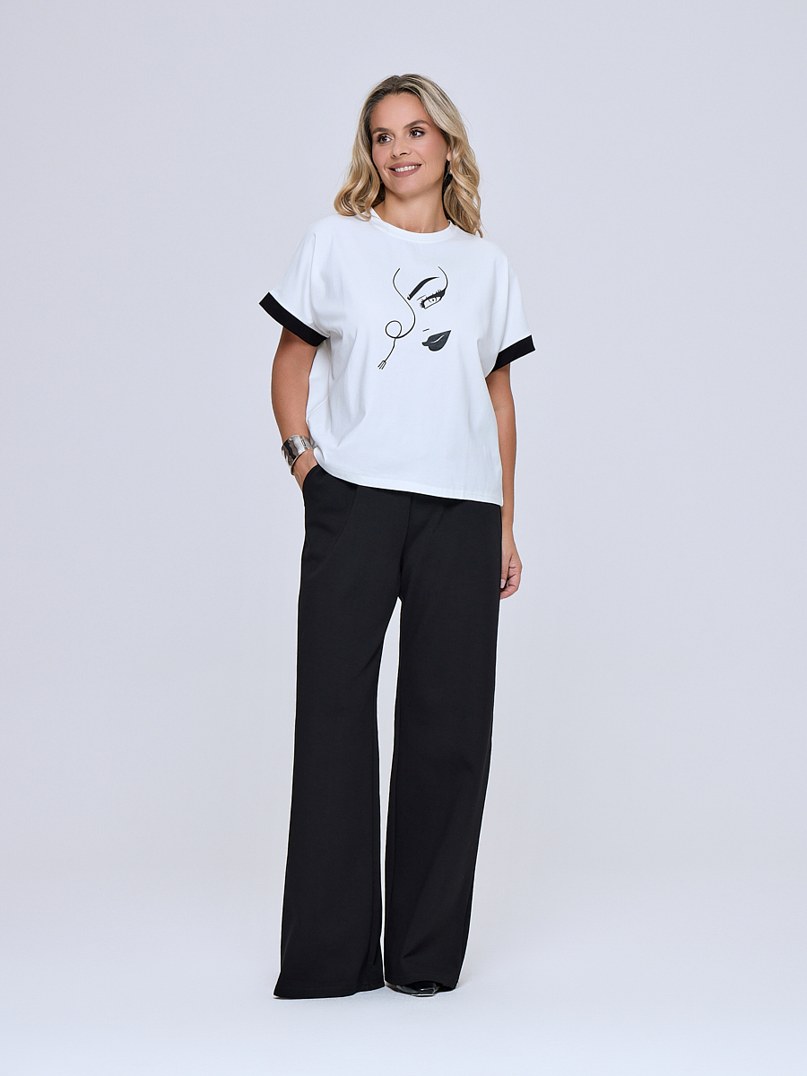 Женская футболка белого цвета с оригинальным принтом — стильный акцент для повседневного гардероба. Свободный крой и заниженная линия плеча создают комфортный и слегка расслабленный силуэт, а контрастные черные манжеты на рукавах добавляют графичности. Центральный принт в виде абстрактного лица смотрится современно и привлекает внимание, делая модель не просто базовой, а выразительной деталью образа. Круглый вырез подчёркивает универсальность фасона и позволяет легко сочетать футболку с различной одеждой.