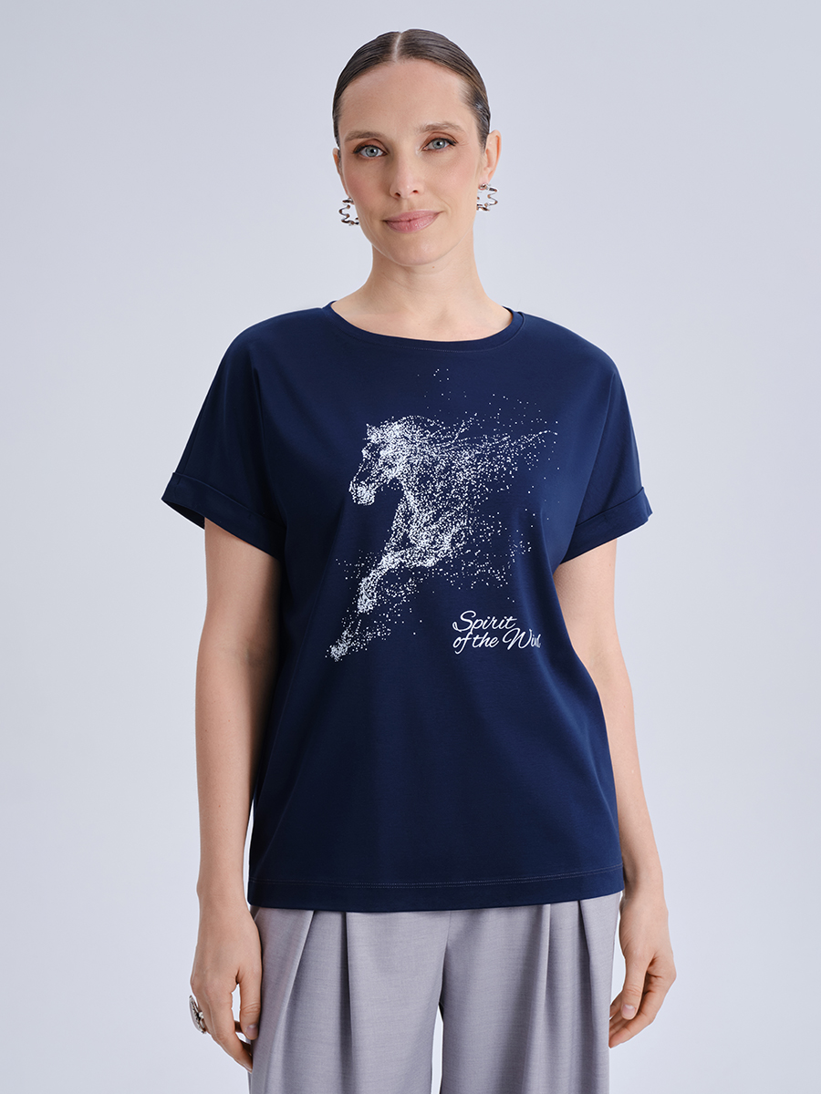 Тёмно-синяя футболка из 100% мерсеризованного хлопка с графичным принтом — выразительная и универсальная модель, способная стать акцентом в повседневном образе. Прямой силуэт и стандартная длина обеспечивают комфортную посадку, а аккуратный круглый вырез и отвороты на рукавах придают образу немного расслабленности. В центре внимания — эффектный принт с изображением бегущей лошади, выполненный в стиле цифровой графики, и надпись Spirit of the Wild, подчёркивающая идею свободы и энергии.¶¶Мерсеризованный хлопок делает ткань особенно гладкой, слегка блестящей и долговечной. Благодаря натуральному составу изделие хорошо дышит и комфортно в носке. Эта футболка прекрасно сочетается с джинсами, классическими брюками или юбками и подойдёт как для прогулок, так и для повседневных образов в городском стиле.