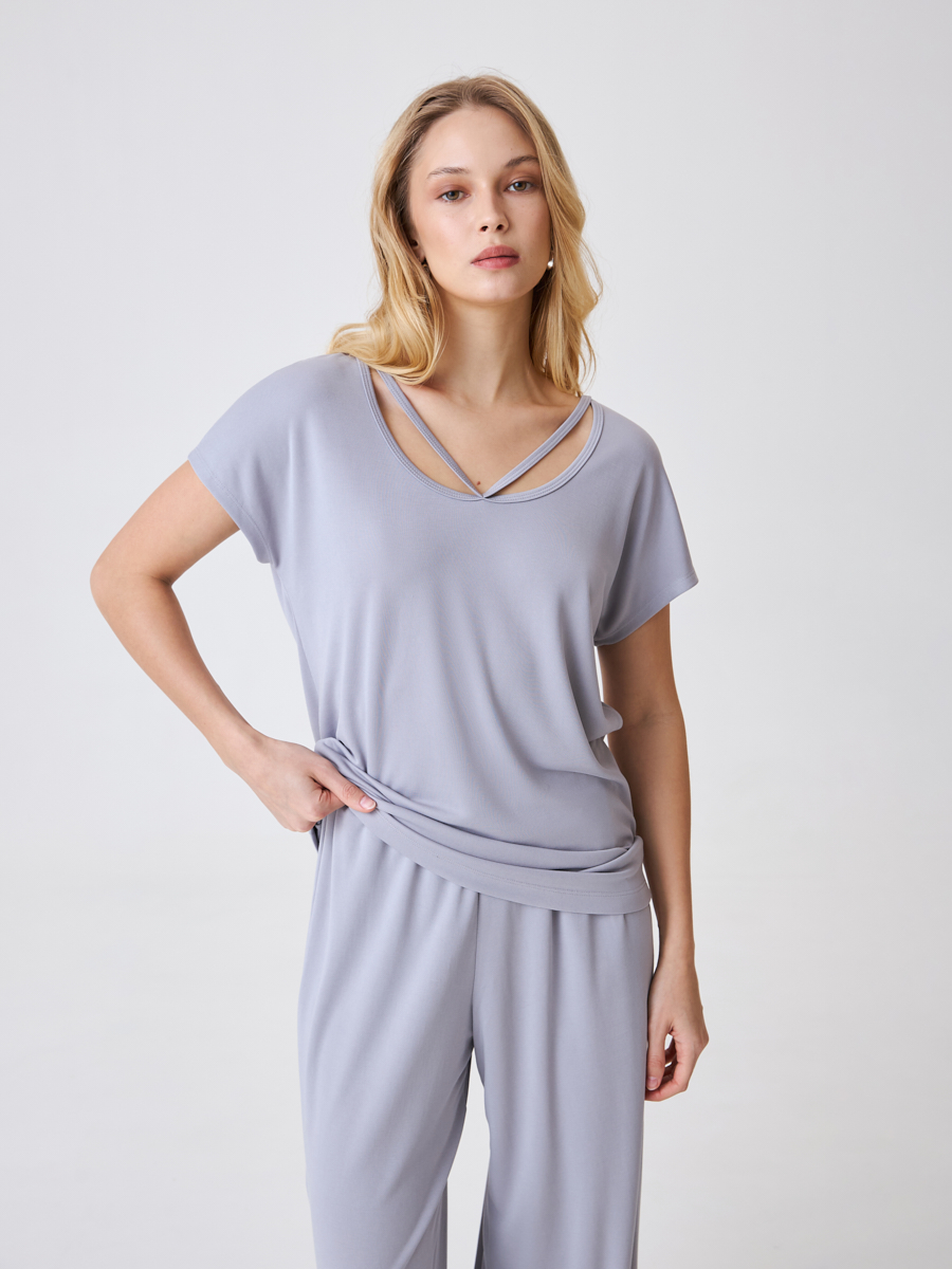 Свободная однотонная футболка из мягкого трикотажа в светло-сером цвете. Модель универсального прямого кроя выполнена в стандартной длине и имеет короткие рукава. Глубокий овальный вырез оснащен декоративными элементами в виде тонких лент. На передней части изделия они расположены по диагонали и образуют V-рисунок с акцентом на декольте и ключицах. Сзади же проходит одна лента на линии шеи.