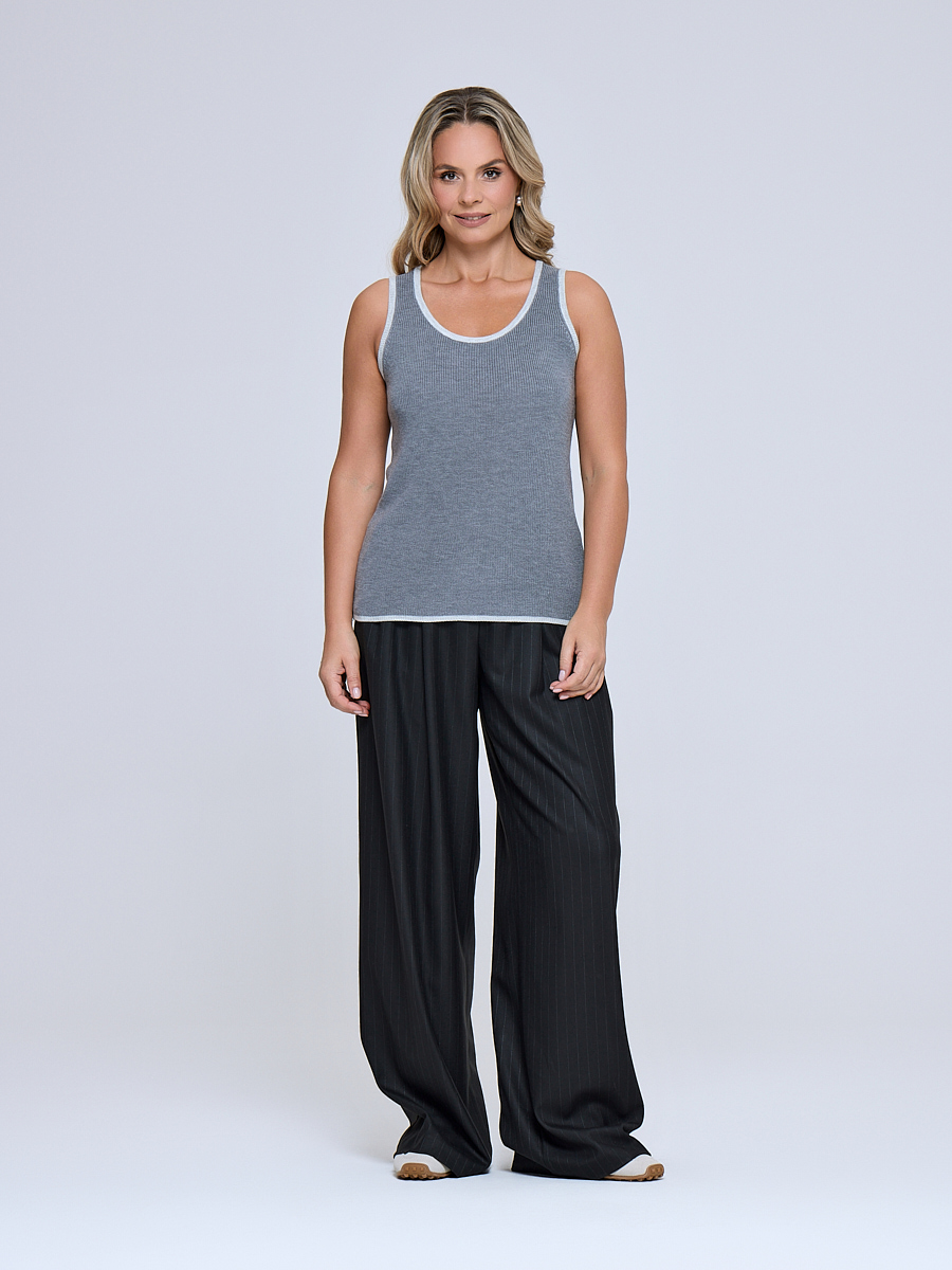 Цвет модели — актуальный серый, по краям белая окантовка придает изделию аккуратный и опрятный вид. Благодаря сложному смесовому составу ткани, топ сохраняет форму после стирки и не требует сложного ухода. Отличный выбор для повседневных образов и минималистичных луков с джинсами, брюками или юбками.