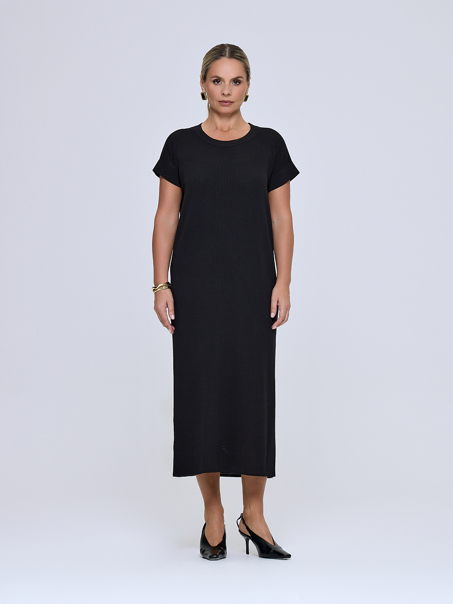 Женское трикотажное платье в черном цвете — это универсальная основа для элегантных и повседневных образов. Прямой крой подчеркивает естественные линии силуэта, а мягкая фактура вязаного полотна создаёт ощущение комфорта и уюта. Круглый вырез горловины и короткие рукава с отворотом добавляют простоты и лаконичности, благодаря чему платье гармонично смотрится как в офисной среде, так и в расслабленных casual-комплектах. Средняя длина миди делает модель практичной и удобной для разных случаев.