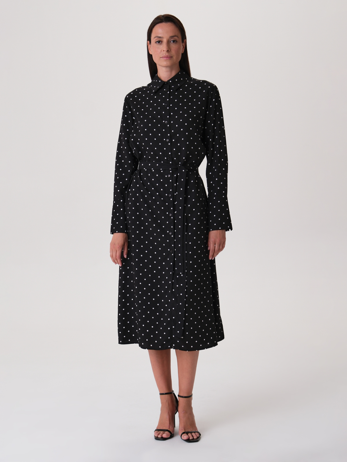 Платье-рубашка - элегантная и стильная одежда, сочетающая в себе классический крой рубашки и женственность платья. Идеально подходит для создания изысканных образов и абсолютно не капризно в стилизации. Данная модель представлена в черном цвете в крупный горошек, который всегда невольно ассоциируется с романтикой. Пояс в комплекте подчеркнет талию, создавая при этом силуэт «песочные часы». Длина миди, по бокам имеются разрезы до середины бедра, а вдоль всего изделия проходит ряд пуговиц.