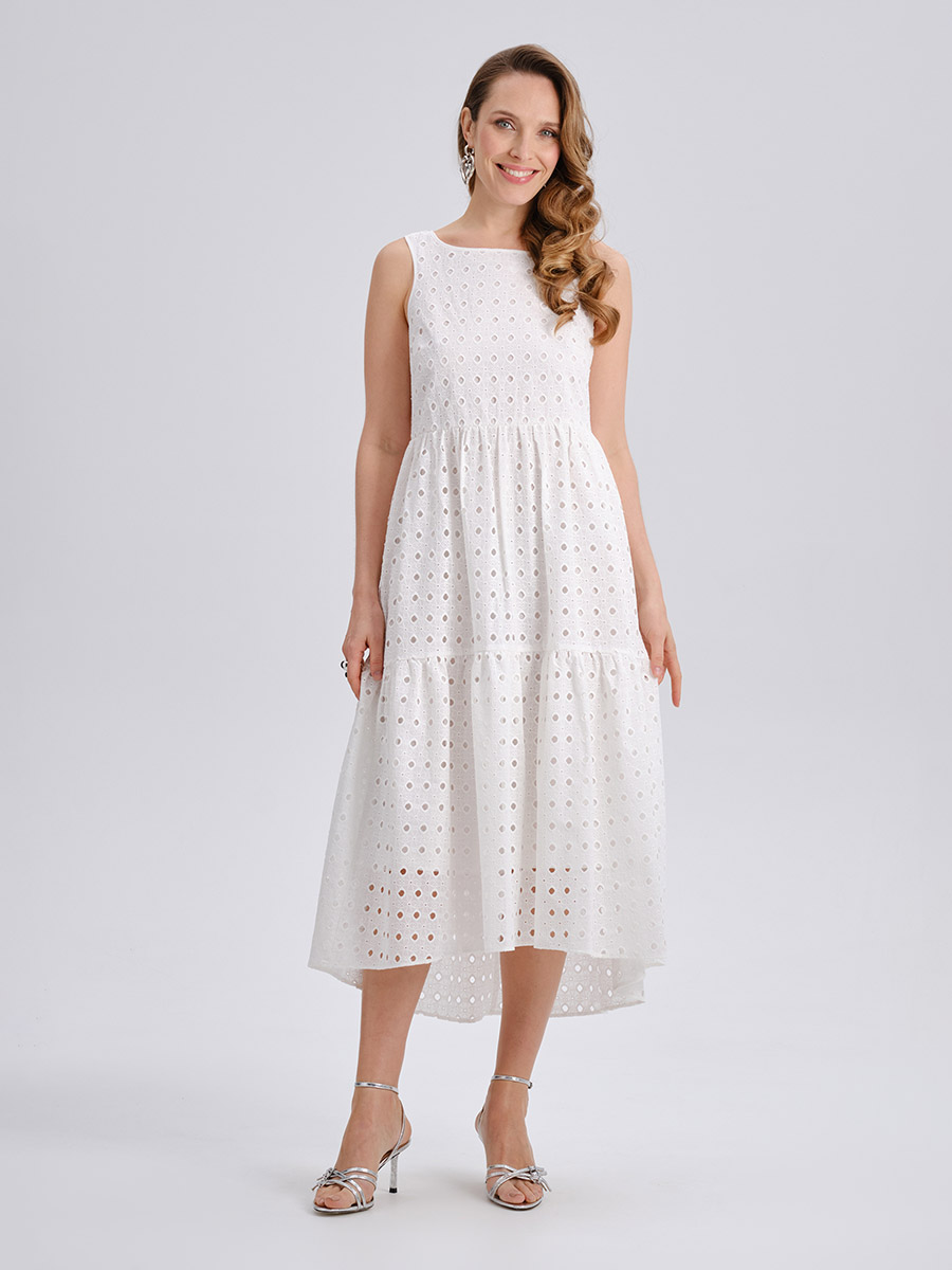 Платье трапецевидного силуэта в длине миди с юбкой из двух ярусов со сборкой. Выполнено из 100% хлопка, меется подклад также из 100% хлопка. Отличительная особенность изделия: перепад по низу платья. Застежка по заднему среднему шву на петлю и пуговицу.