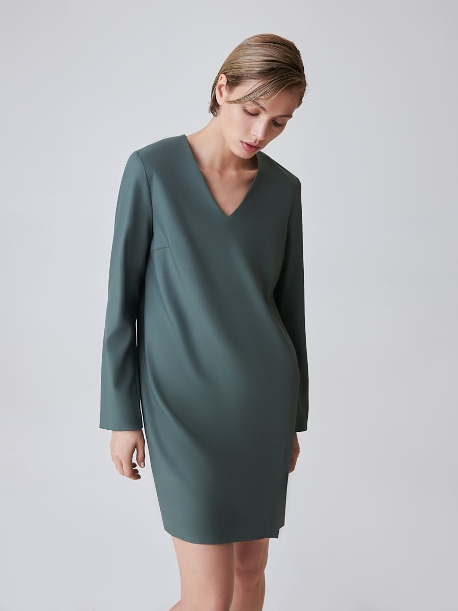 Платье мини в свободном прямом крое станет верным помощником в составлении стильных повседневных образов. Актуальный в последних сезонах оливковый цвет гармонично сочетается в другими природными оттенками, что делает модель универсальной. Комфортная длина до середины бедра спереди оснащена аккуратным разрезом. Рукава до запястья, деликатный V-образный вырез делает акцент на шее, визуально удлиняя ее.