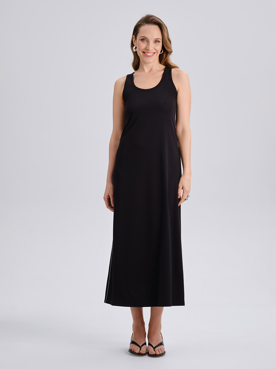 Базовое платье макси в насыщенном чёрном цвете — лаконичное решение для повседневных образов с ноткой сдержанной элегантности. Прямой удлинённый силуэт с округлым вырезом и спортивной проймой плеч напоминает классическую модель в стиле майки, придавая образу актуальность и современность. Плотная, но эластичная ткань мягко облегает фигуру, не сковывая движений, а боковые разрезы обеспечивают комфорт при ходьбе и визуально облегчают силуэт.¶¶Материал с добавлением тенсела, вискозы, нейлона и спандекса делает платье приятным к телу, воздухопроницаемым и устойчивым к деформации. Благодаря сбалансированному составу ткань сохраняет форму и гладкость, легко переносит стирку и не требует сложного ухода. Универсальность модели позволяет носить её как с минималистичными сандалиями в городских образах, так и с акцентными украшениями и обувью на каблуке — для вечерних выходов.