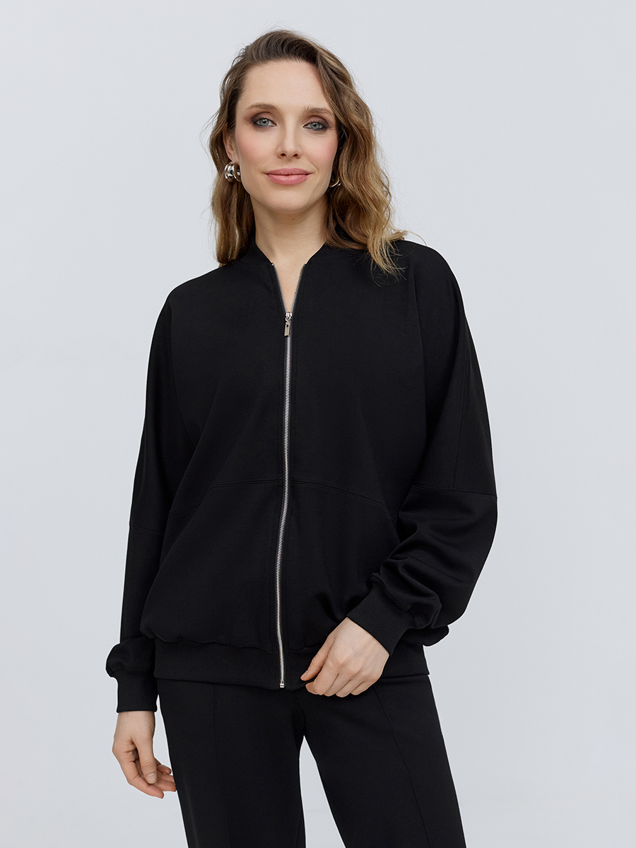 Свитшот прямого кроя из вискозы на молнии. Рукав со спущенным плечом полной длины. По низу рукава притачная манжена. Воротник полустойка.