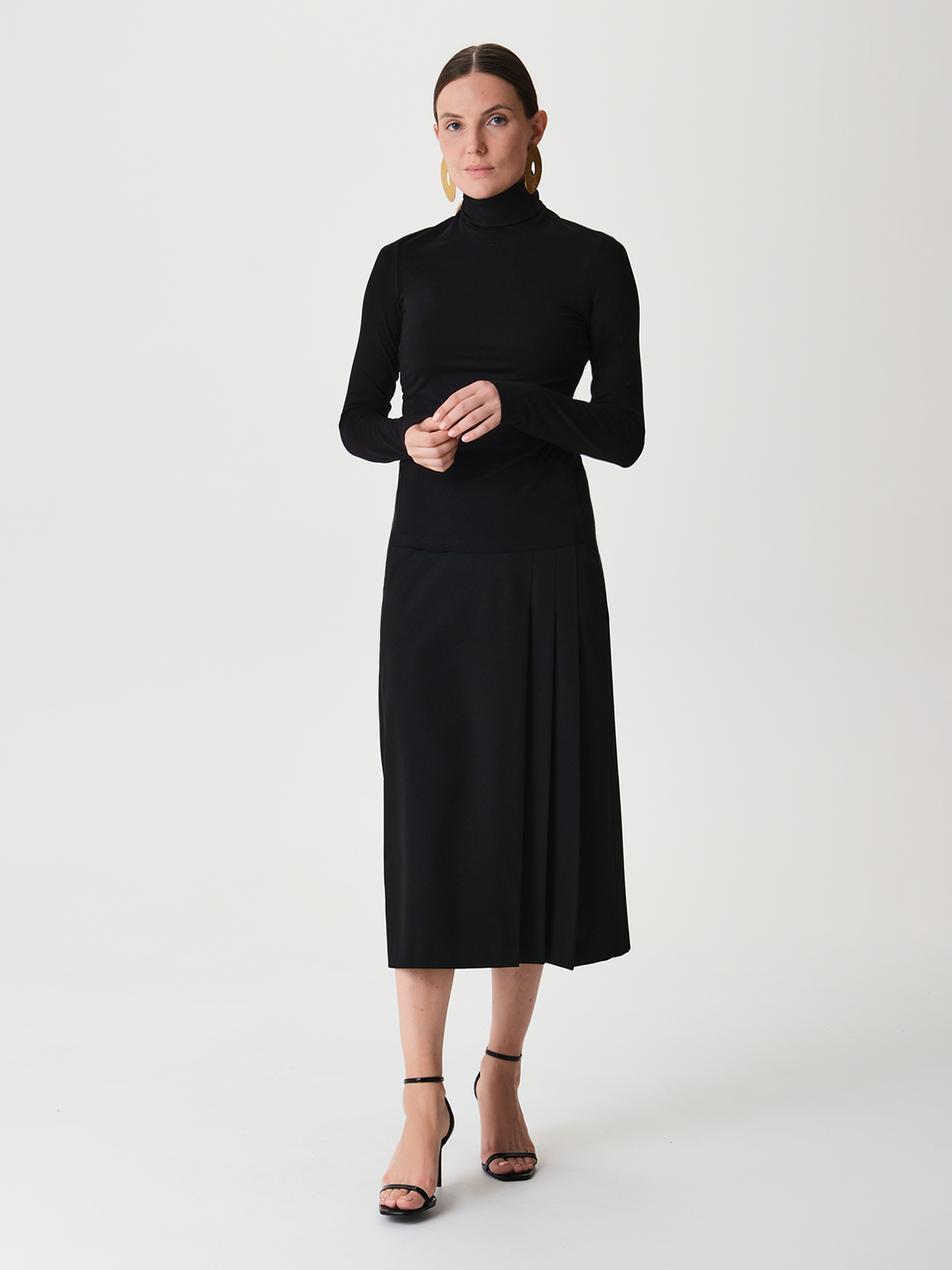 Черная трикотажная водолазка - один из базовых элементов гардероба. Прилегающий крой подчеркивает фигуру и создает элегантный женственный силуэт. Комфортный высокий воротник не сковывает движение, а длинные рукава прикрывают запястье. Мягкий эластичный трикотаж премиального качества приятно ложится к телу, не просвечивает и не линяет. Водолазка отлично смотрится как самостоятельная единица, но также с ее помощью можно собрать актуальный многослойный лук.