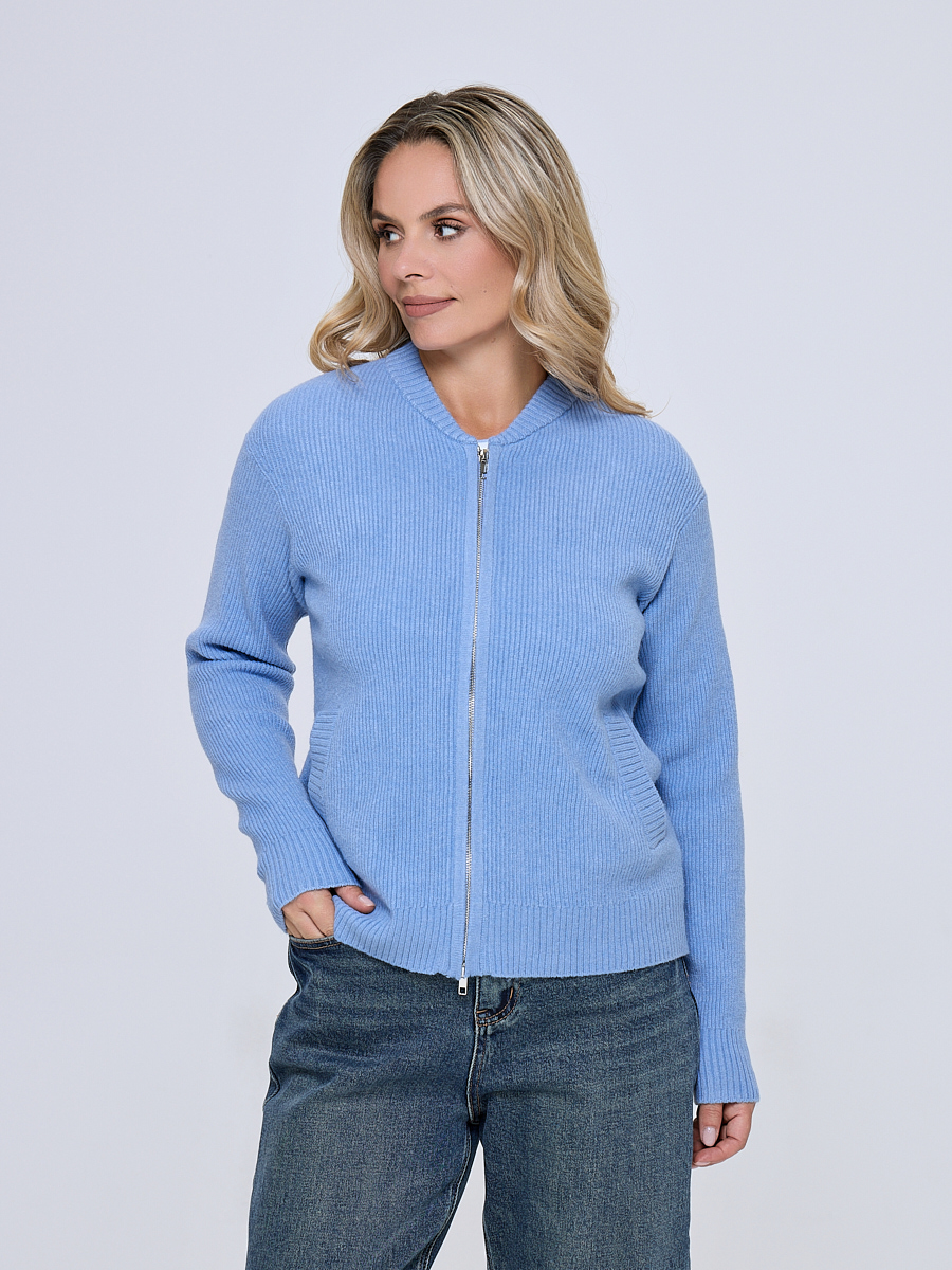Женский кардиган тёмно-голубого цвета выполнен из мягкой и уютной трикотажной пряжи, которая сочетает в себе нежность кашемира, практичность акрила и прочность нейлона. Лаконичный дизайн с прямым силуэтом и застёжкой на молнию делает модель универсальной и удобной для повседневной носки. Кардиган имеет аккуратный воротник-стойку и эластичные манжеты, которые обеспечивают комфортную посадку и защищают от прохлады.