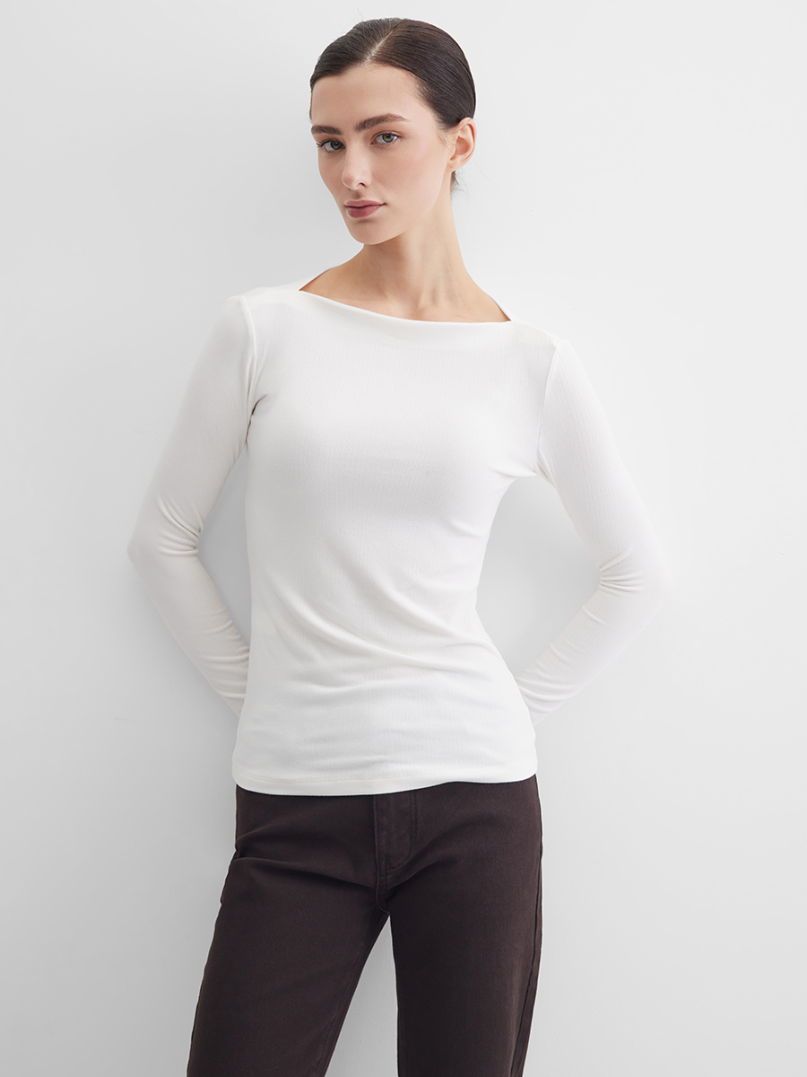 Приталенный лонгслив с актуальным вырезом "лодочка" из мягкого трикотажа "лапша" может стать основой как офисного или делового образа, так и повседневных или нарядных луков. Дополнительный акцент за счет рукавов с напуском и прорезью для пальца придает образу загадочности.