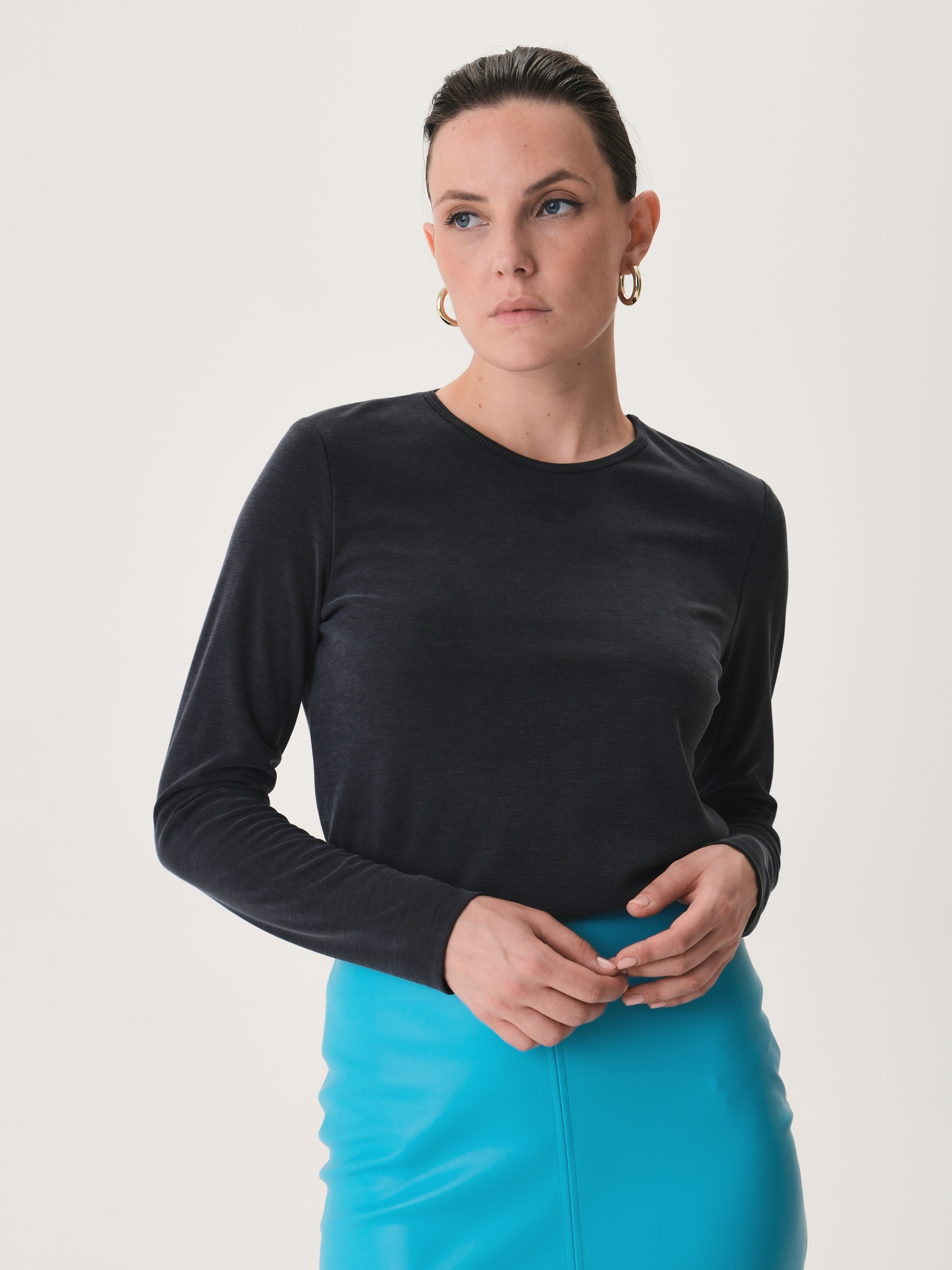 Женственный однотонный лонгслив в актуальном темно-сером оттенке. Модель выполнена из мягкой трикотажной ткани. Благодаря премиальному качеству материалов в составе она приятно ложится к телу, не теряет насыщенность цвета при стирке и комфортно носится на протяжении всего дня. Полуприлегающий крой отлично садится на любой тип фигуры и деликатно скрывает недостатки. Можно стилизовать лонгслив с брюками и джинсами на высокой посадке или элегантными юбками.