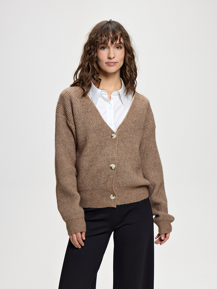 Кардиган с тремя пуговицами в теплом шоколадном цвете — классическая и универсальная модель, которая подходит для создания как casual-образов, так и более строгих луков. Его ключевая особенность — сбалансированный состав ткани, который сочетает в себе натуральность, эластичность, прочность и простоту в уходе.