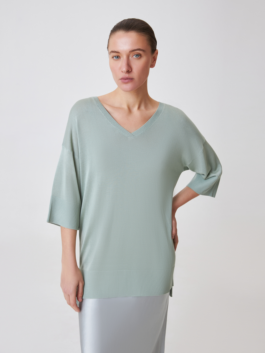 Однотонный пуловер актуального свободного кроя выполнен в приглушенном мятном оттенке. Прямой силуэт изделия позволяет сочетать его с большим количеством вариаций низа. V-образный вырез модели деликатно открывает ключицы и зону декольте. Рукава заканчиваются чуть ниже линии локтя и открывают запястья. Можно дополнить образ аксессуаром в виде тонкого браслета, чтобы сделать акцент на руках. Пуловер имеет асимметричный край с расположенными по бокам разрезами.