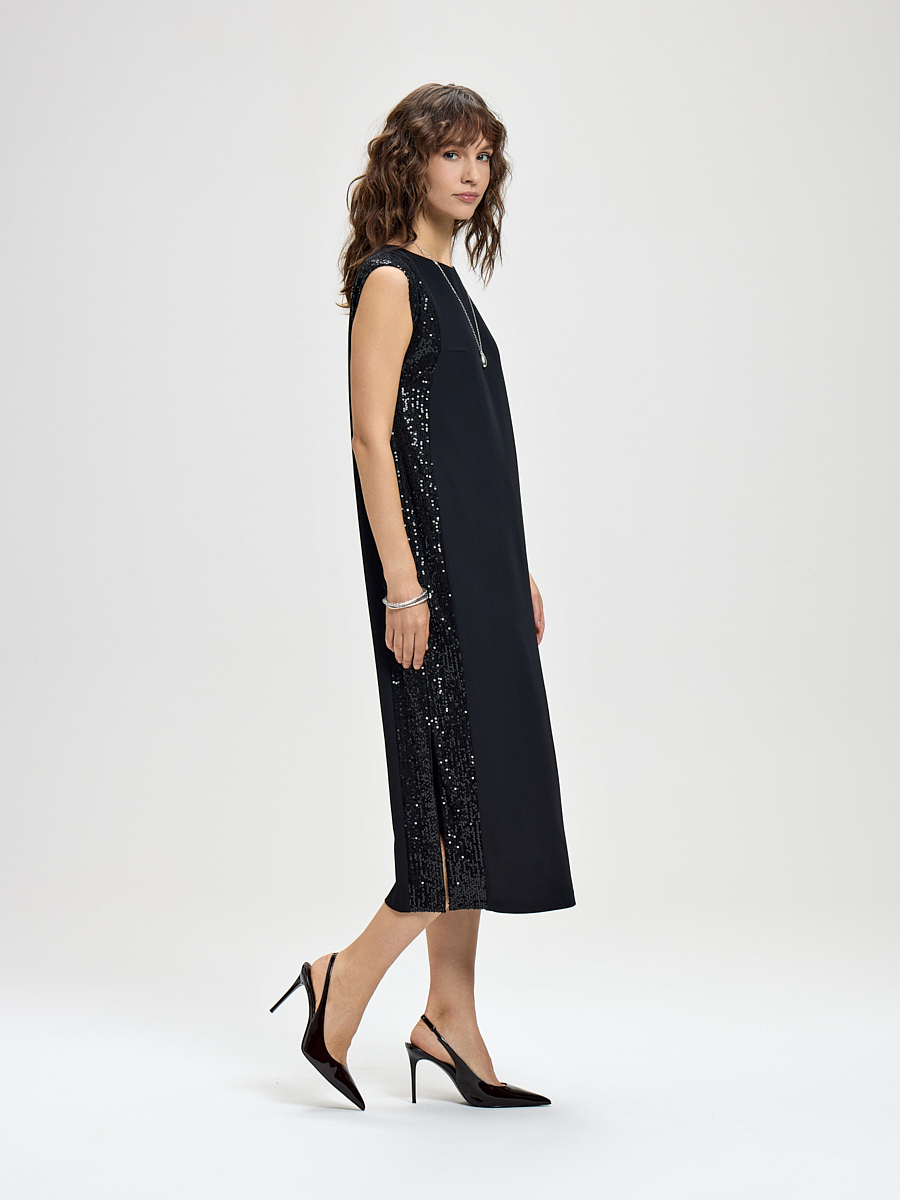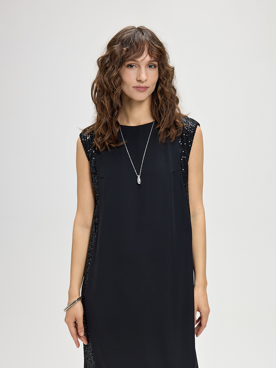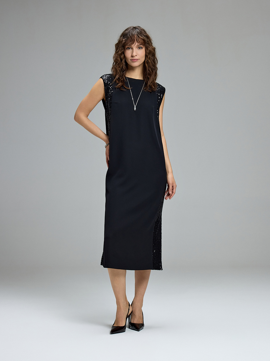 Это платье — воплощение современной элегантности с ноткой дерзкого блеска. Его строгий и лаконичный силуэт без рукавов подчеркивает линию плеч и шеи, создавая утонченный образ. Платье мастерски балансирует между сдержанной классикой и вечерним гламуром. Благодаря черному цвету и строгому крою оно выглядит уместно на коктейльной вечеринке, деловом ужине или свидании.