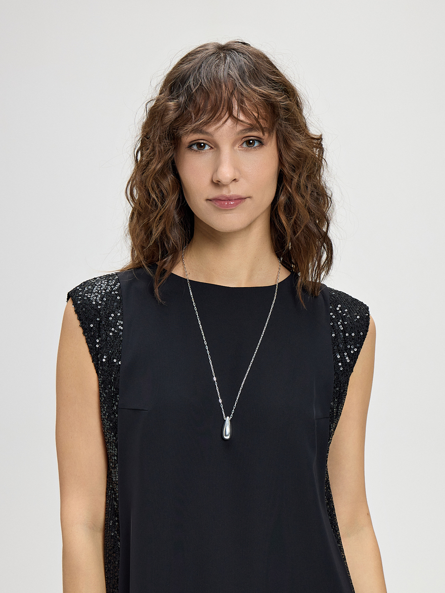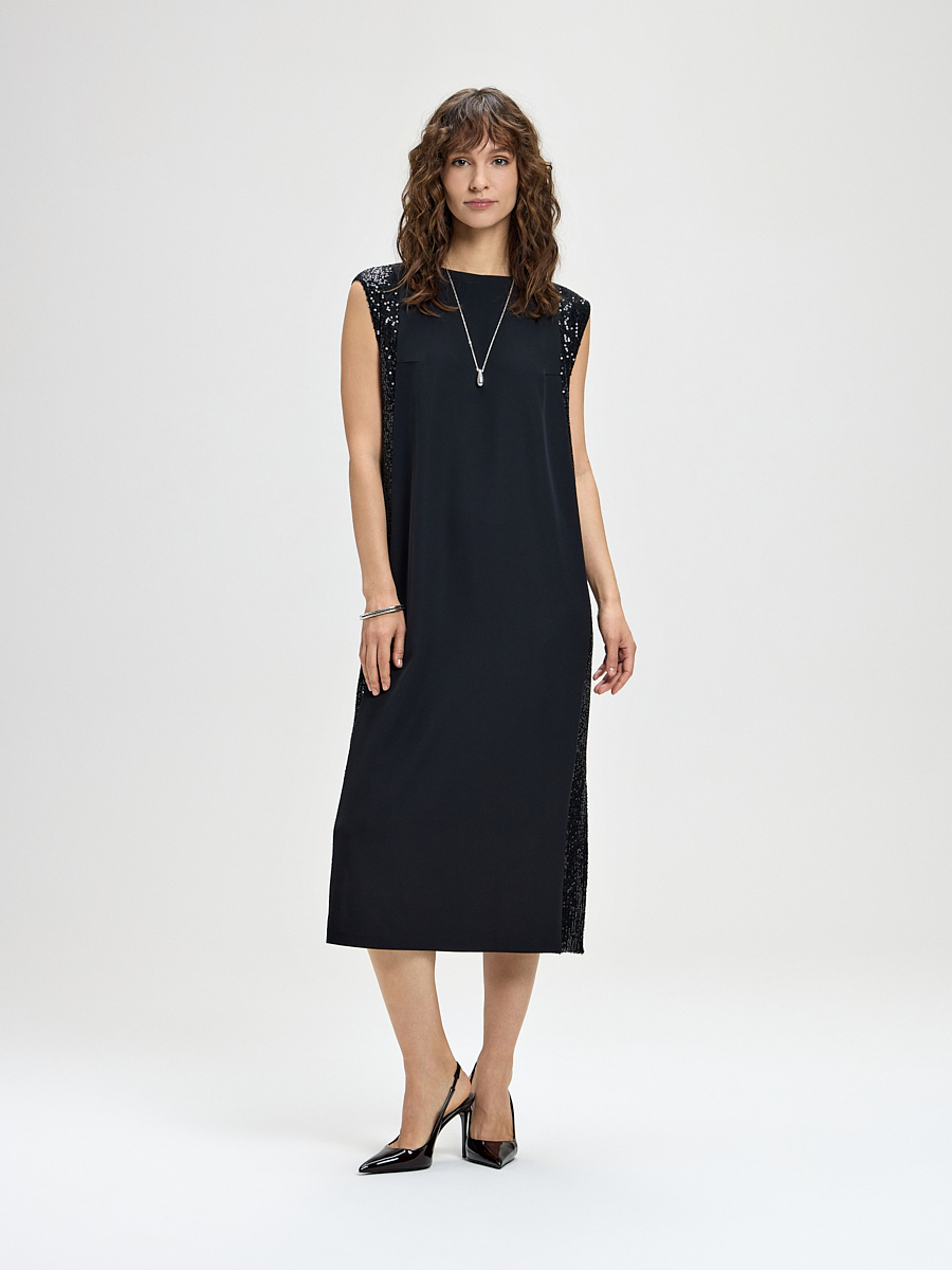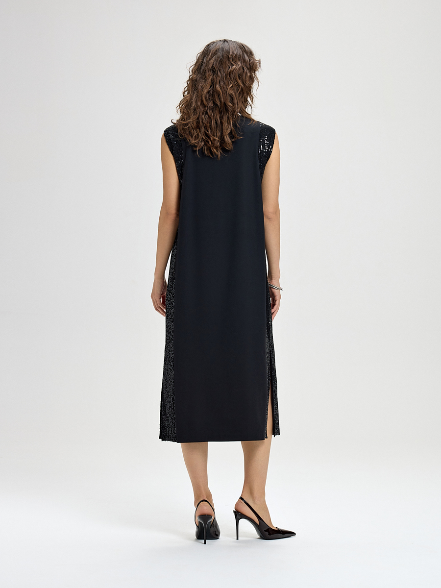 Это платье — воплощение современной элегантности с ноткой дерзкого блеска. Его строгий и лаконичный силуэт без рукавов подчеркивает линию плеч и шеи, создавая утонченный образ. Платье мастерски балансирует между сдержанной классикой и вечерним гламуром. Благодаря черному цвету и строгому крою оно выглядит уместно на коктейльной вечеринке, деловом ужине или свидании.