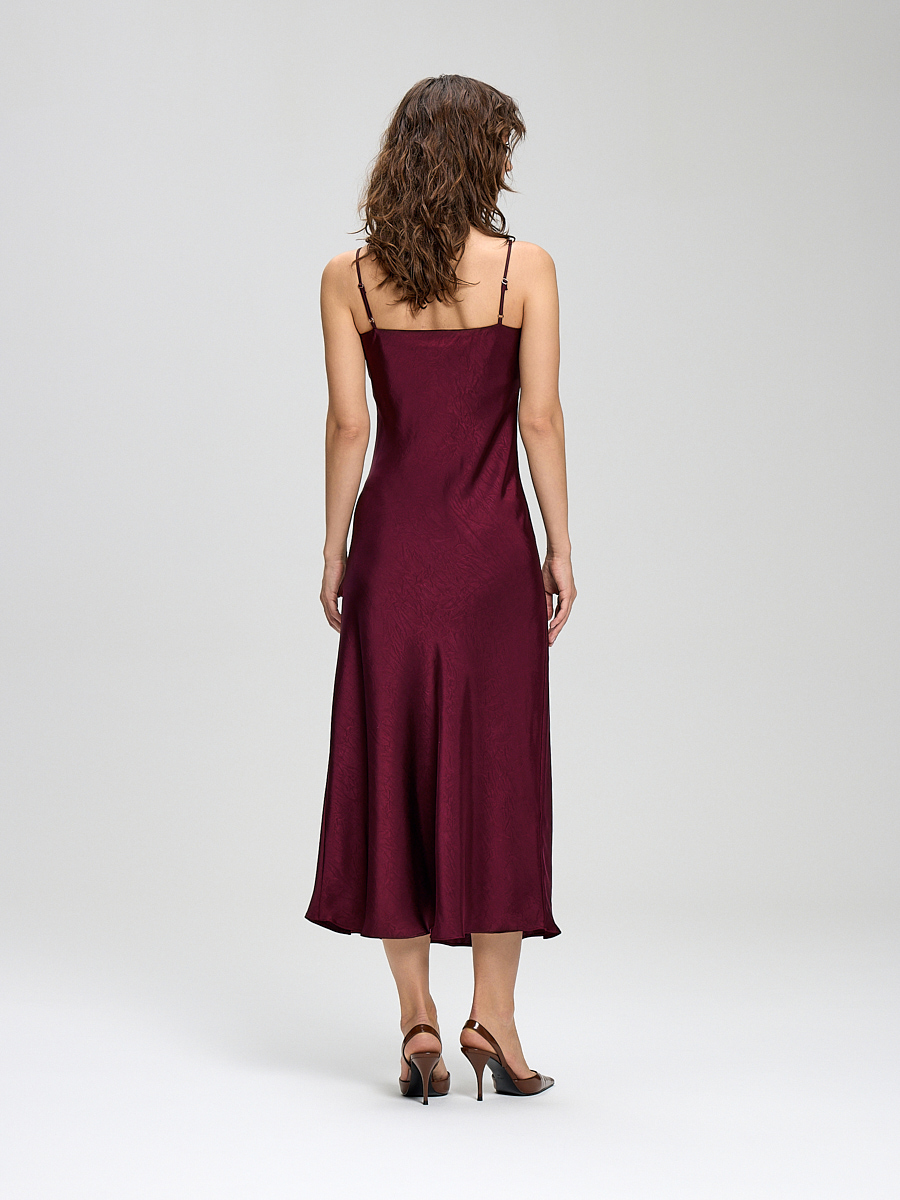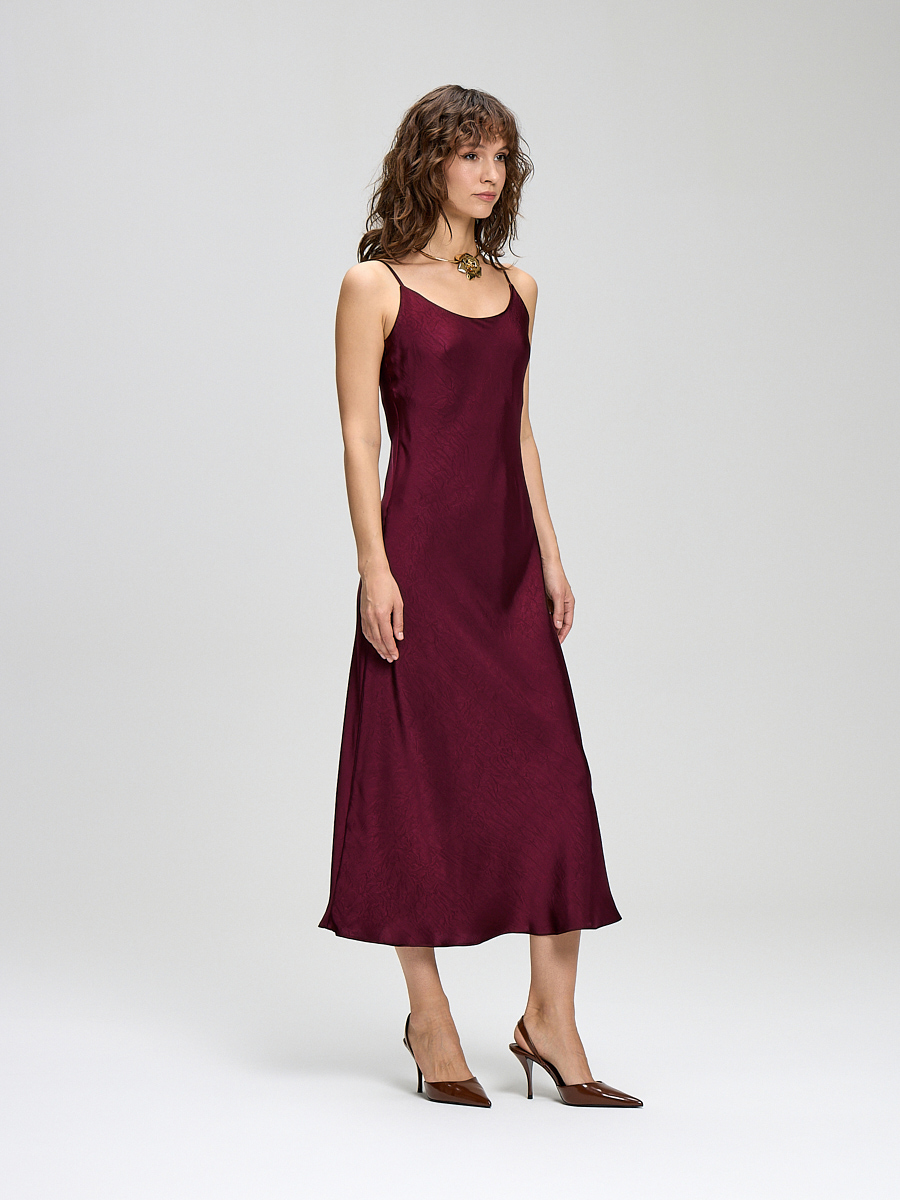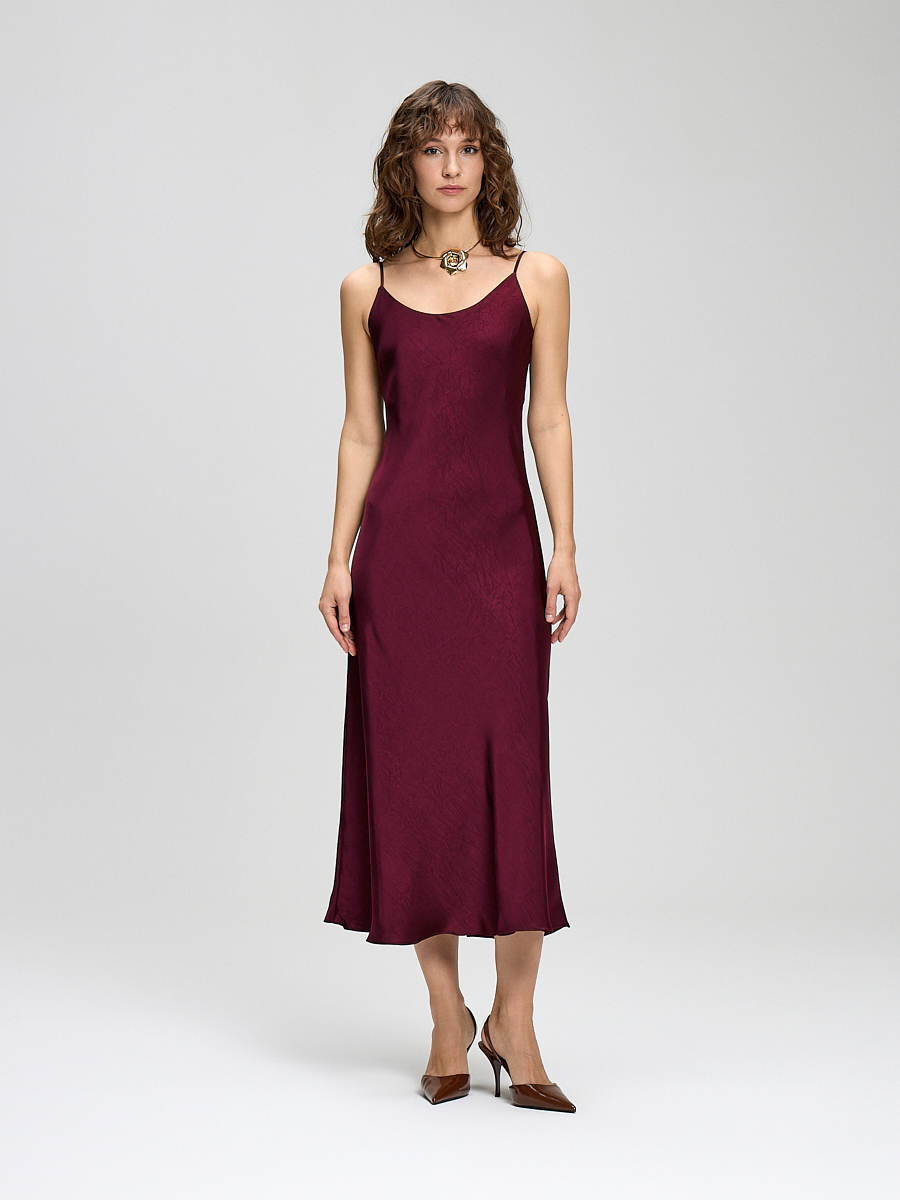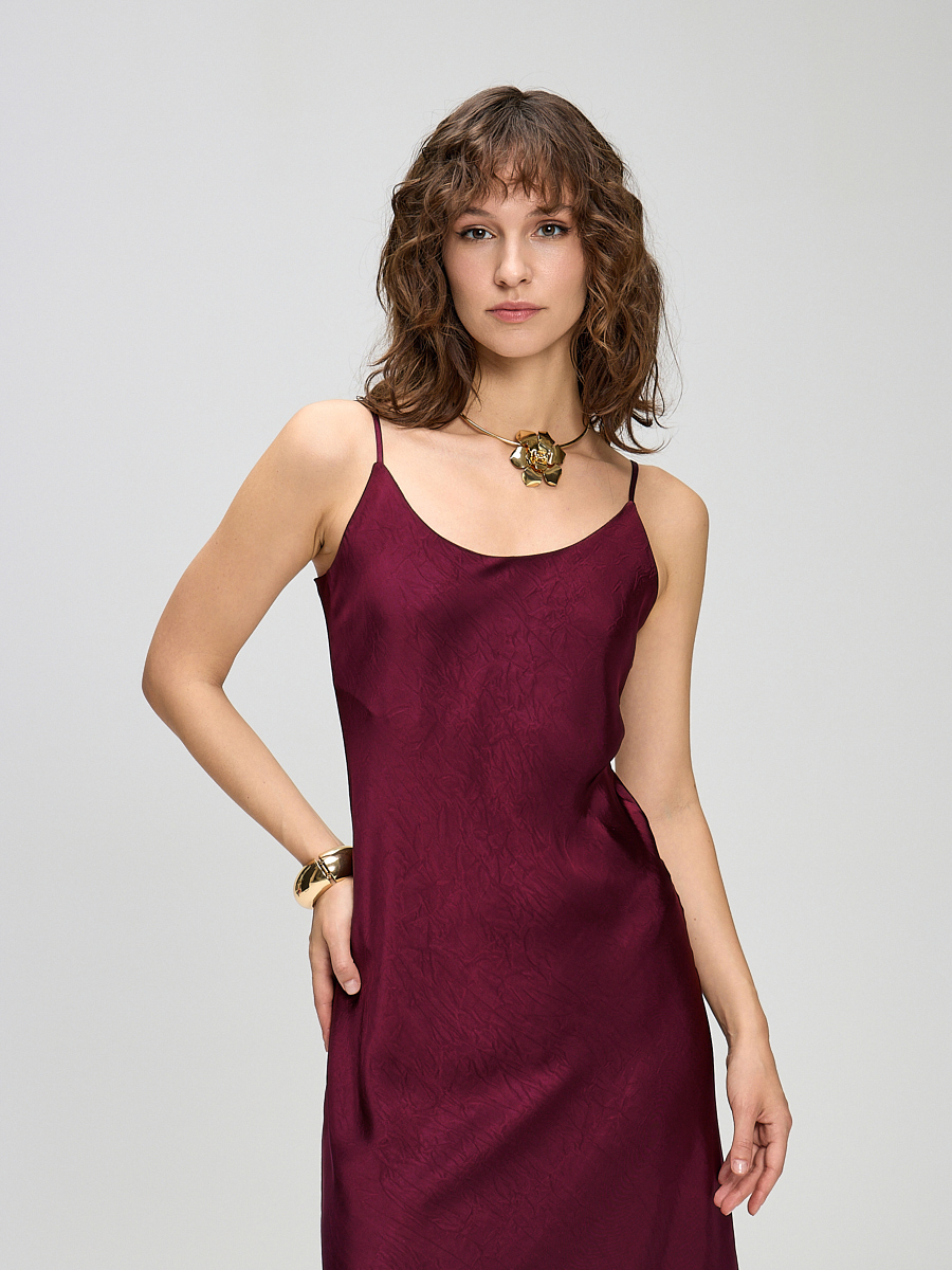 Платье-комбинация в благородном бордовом цвете — элегантная и лаконичная модель, вдохновлённая эстетикой минимализма. Свободный силуэт мягко скользит по фигуре, подчёркивая женственные линии, а круглый вырез и тонкие регулируемые бретели создают изящную и открытую линию плеч. Длина ниже колен придаёт образу утончённость, ткань имеет выразительный фактурный рисунок.