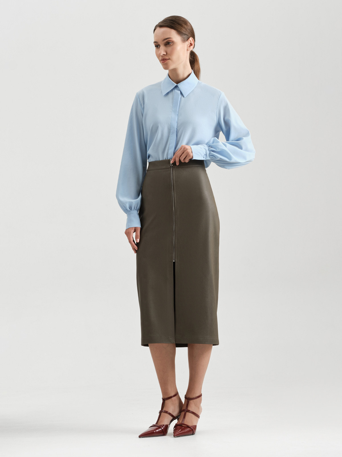 Юбка-карандаш из экокожи - мастхэв в периоды прохладных дней. Модель представлена в спокойном коричневом оттенке и имеет деликатный блеск, свойственный материалу. Плотная ткань премиального качества отлично ведет себя в носке, не растягивается и приятно ложится к телу. Высокая посадка подчеркивает талию, а глубокий вырез спереди демонстрирует красоту и длину ног. На передней части изделия имеется интересная деталь в виде сплошной молнии.
