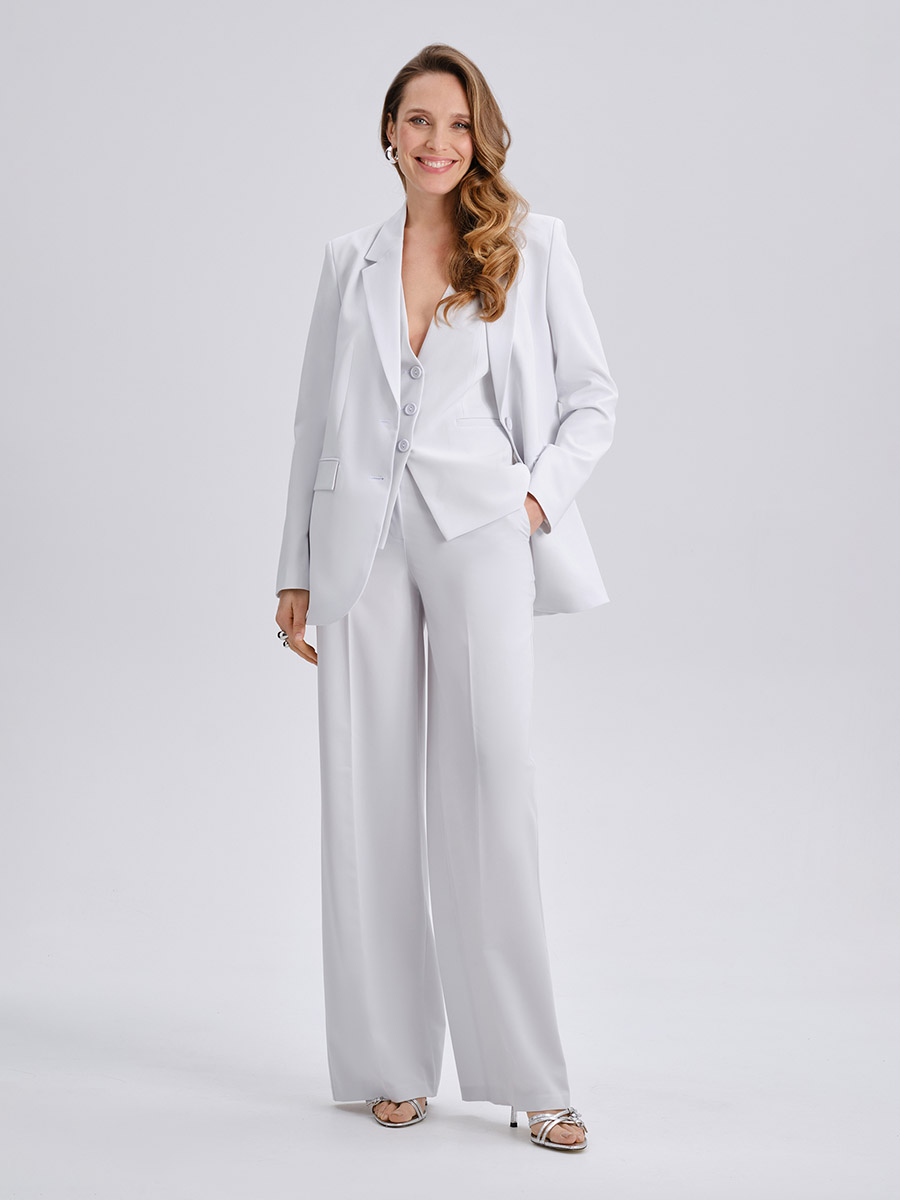Однобортный женский жакет голубого оттенка — элегантная интерпретация классического пиджака в современном прочтении. Прямой силуэт с подчёркнутыми плечами и чёткими линиями создает уверенный, собранный образ. Лаконичные лацканы, застёжка на две пуговицы и прорезные клапаны карманов добавляют строгости, сохраняя при этом актуальность и универсальность. Удлинённый крой позволяет комбинировать жакет с различными элементами гардероба — от классических брюк до джинсов или юбок.