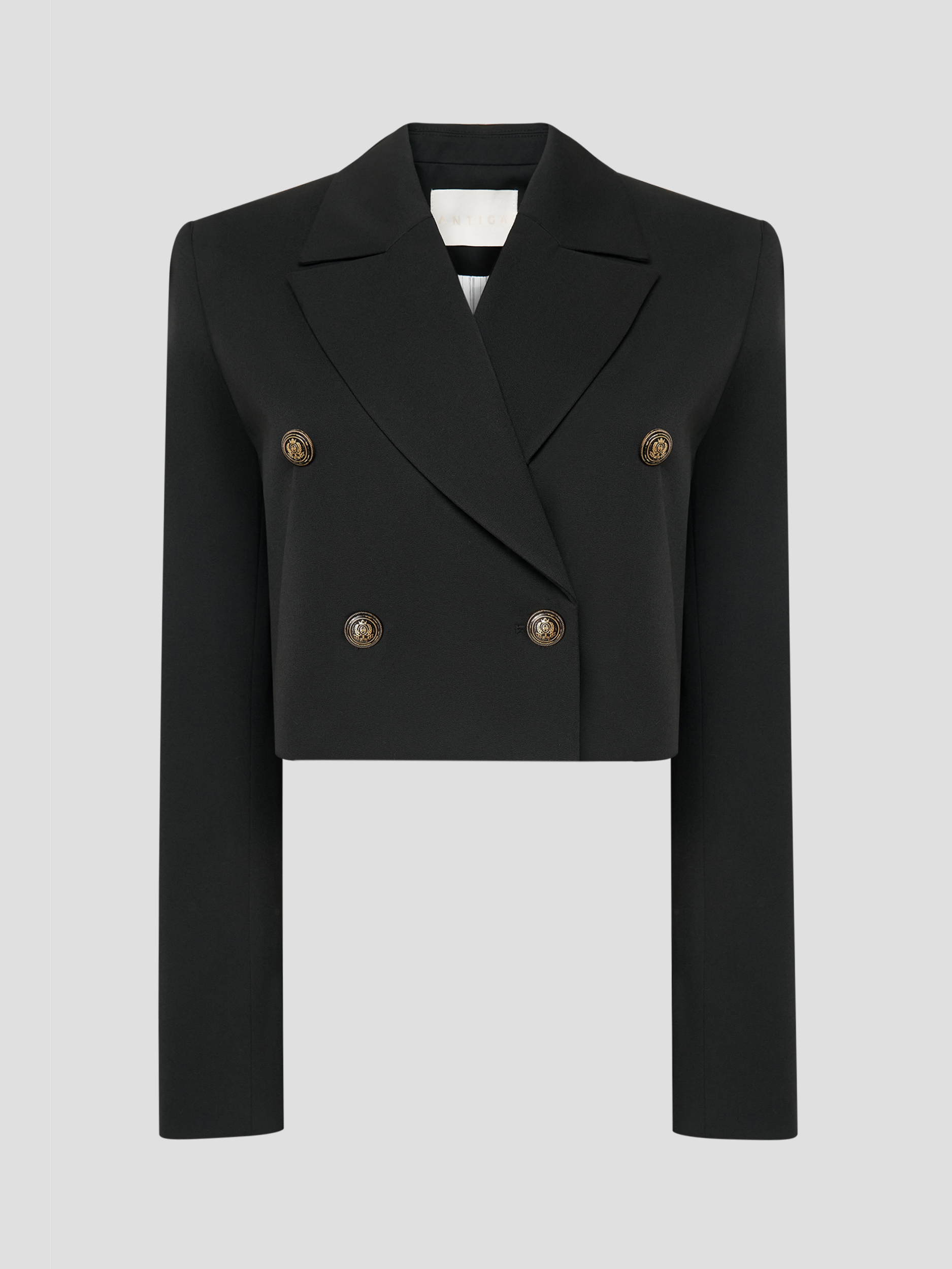 Укороченный двубортный жакет прямого силуэта в базовом черном цвете. Состав с вискозой и эластаном дарит комфорт и свободу движений. Материал хорошо держит форму и приятен к телу. Изюминка — полосатая подкладка, которая добавляет характера даже самому сдержанному образу.
